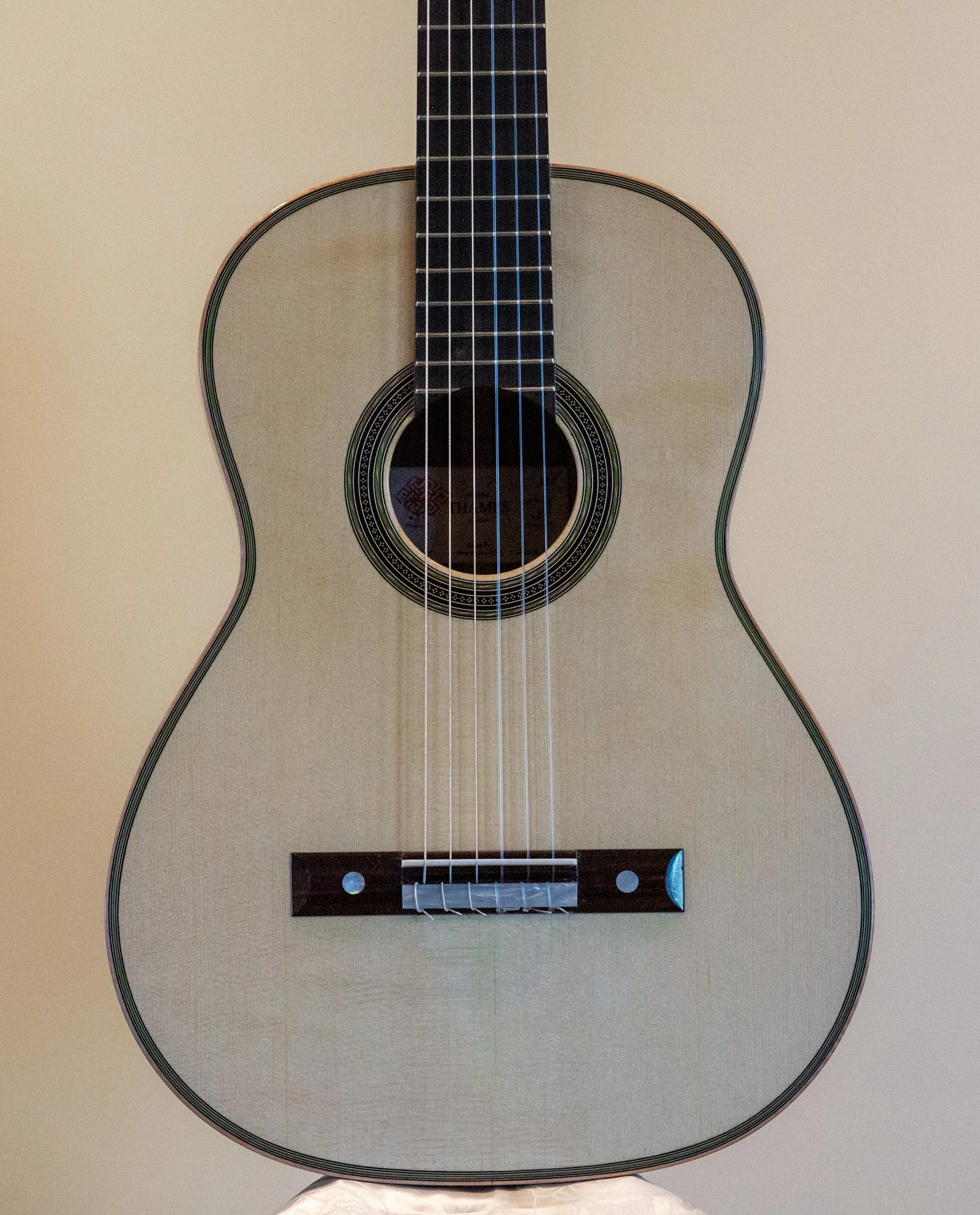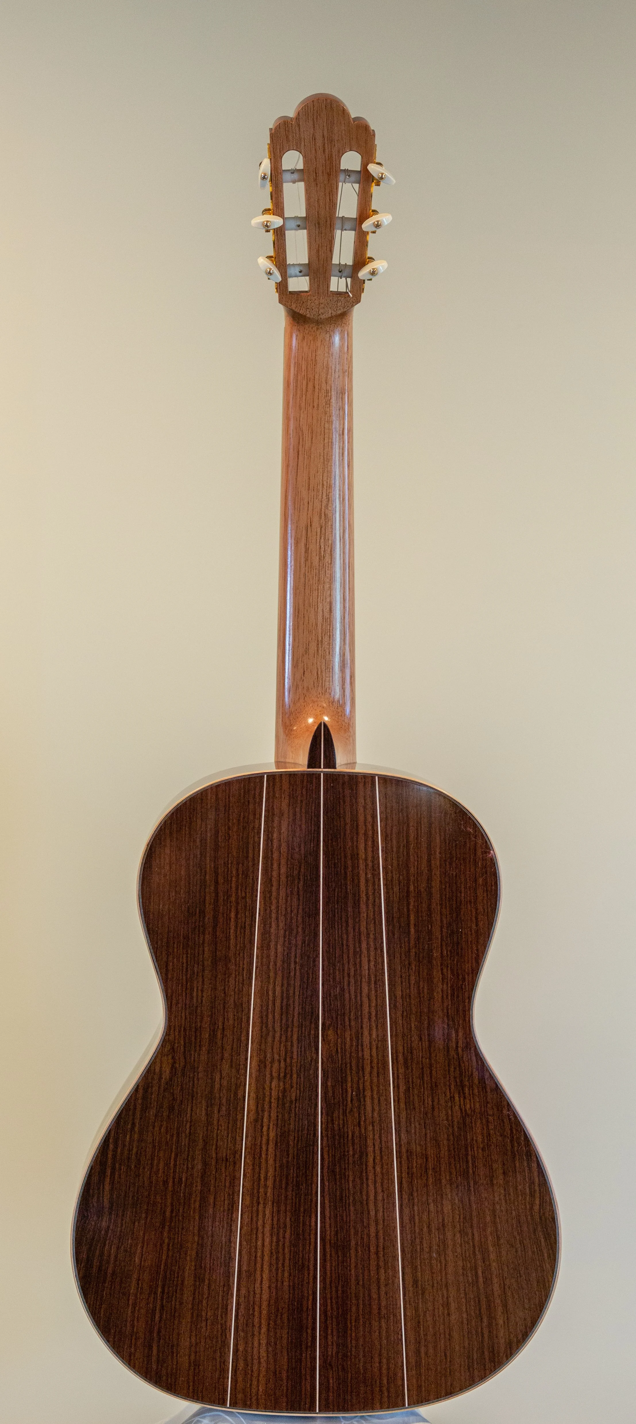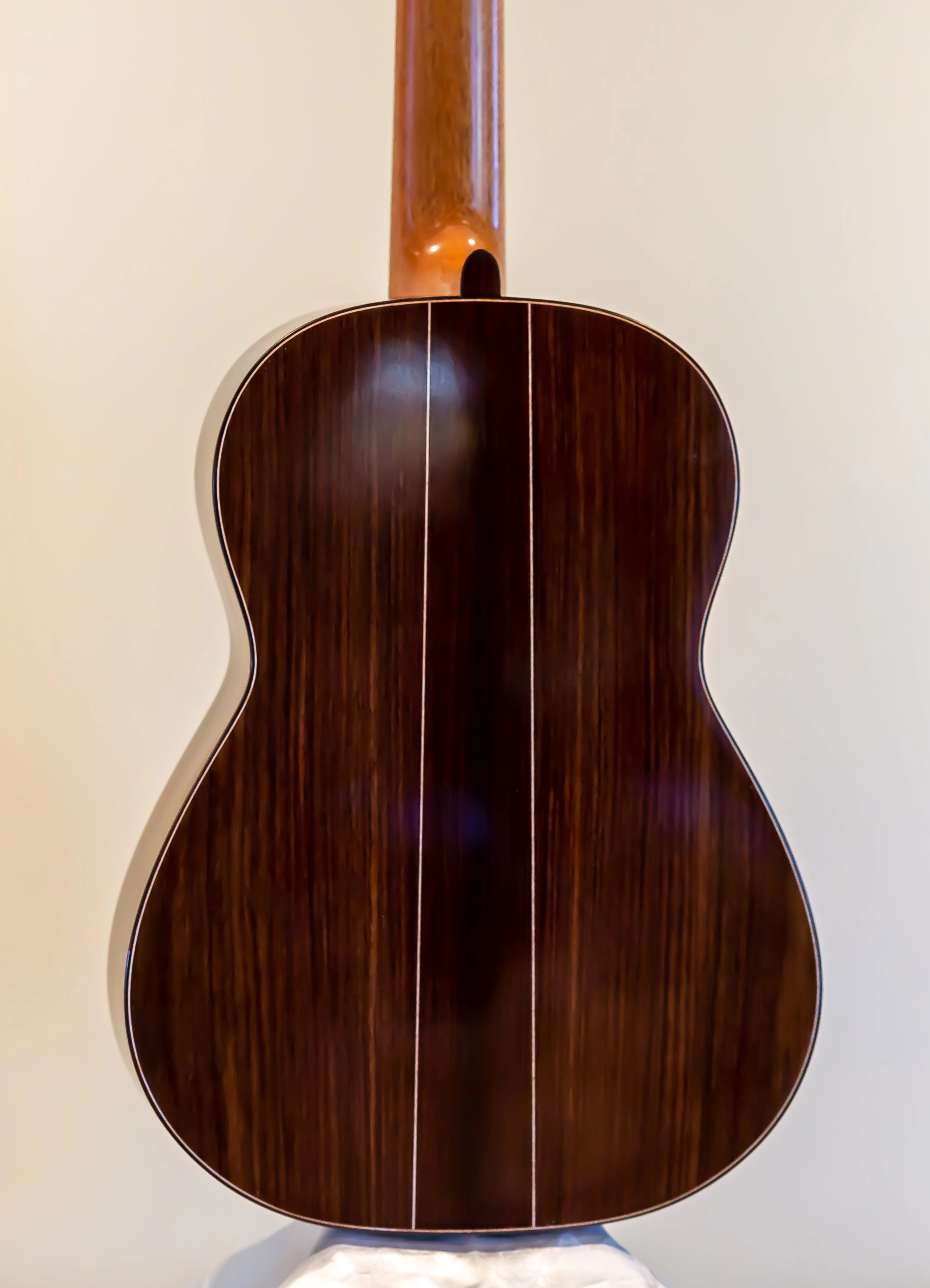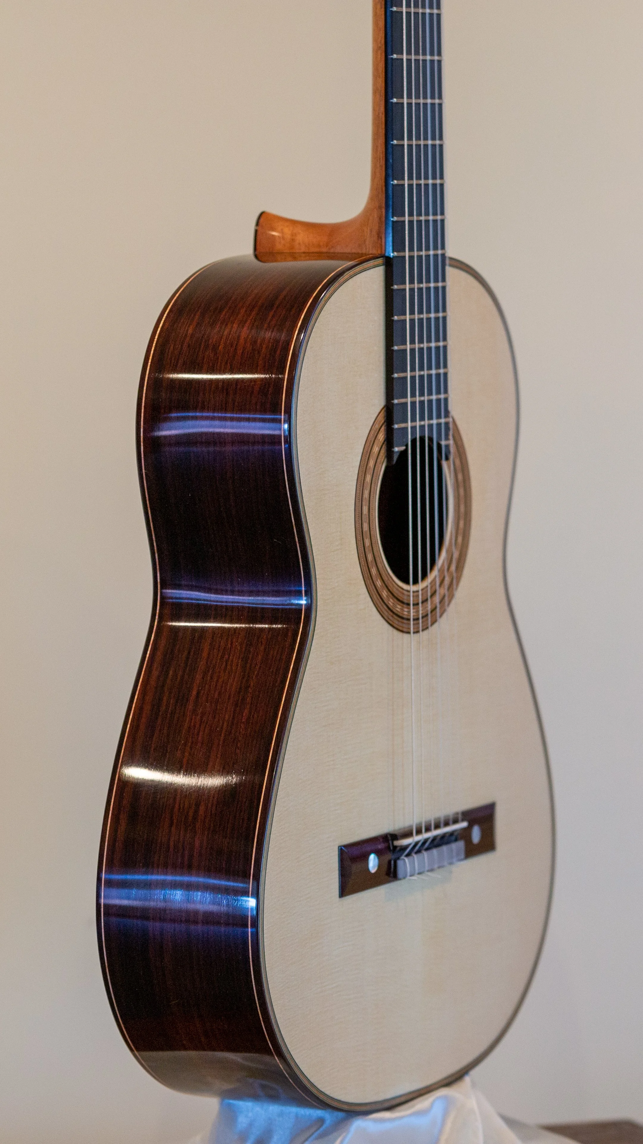 New Solid spruce soundboard with East Indian rosewood back and sides accented with birdseye maple center strip. Scale 650 mm. Very open and luscious tone. PRICE $8400. Posted June 2021. SOLD