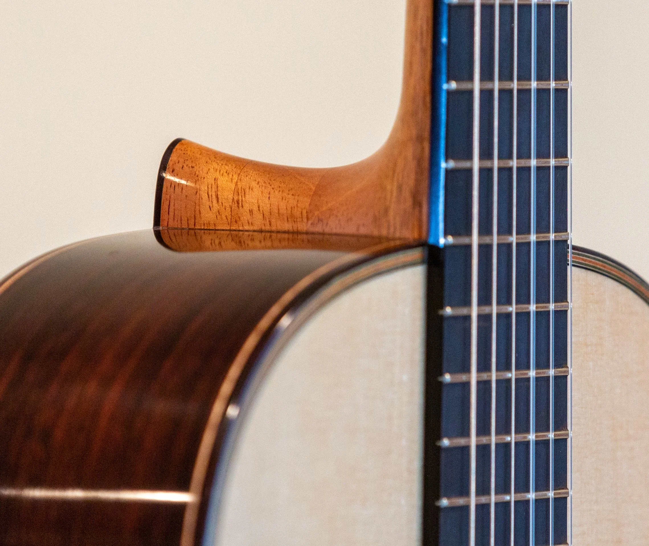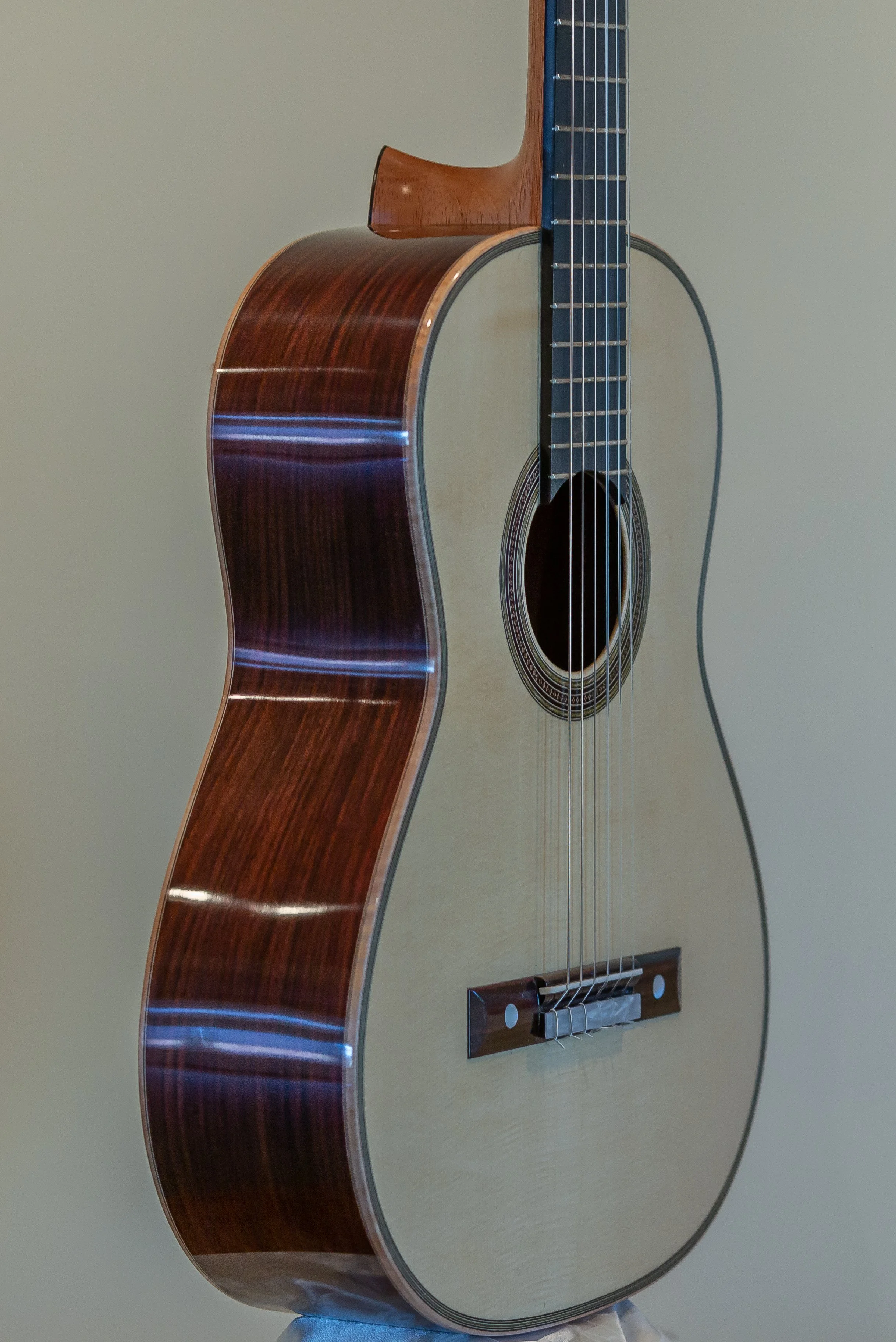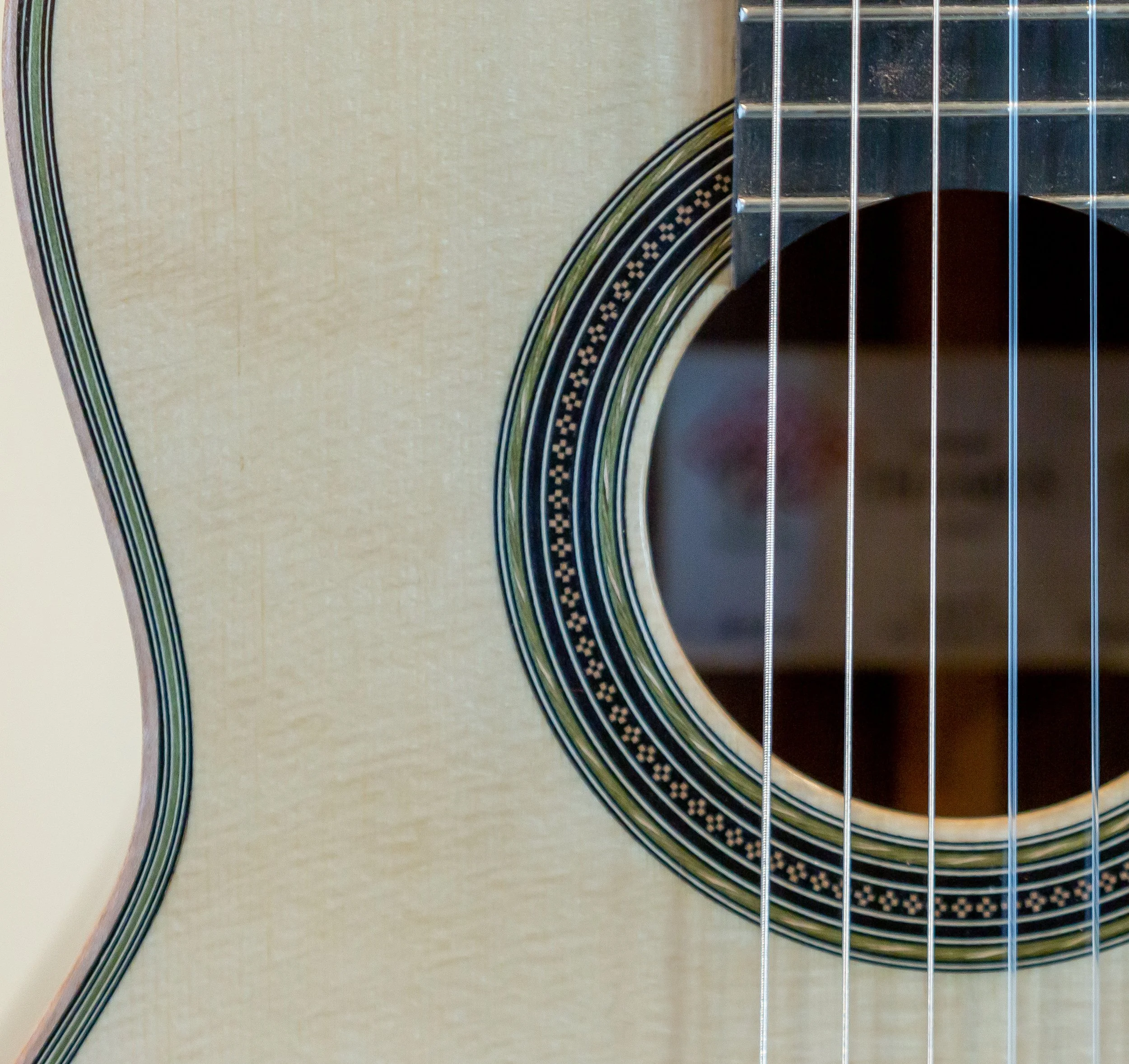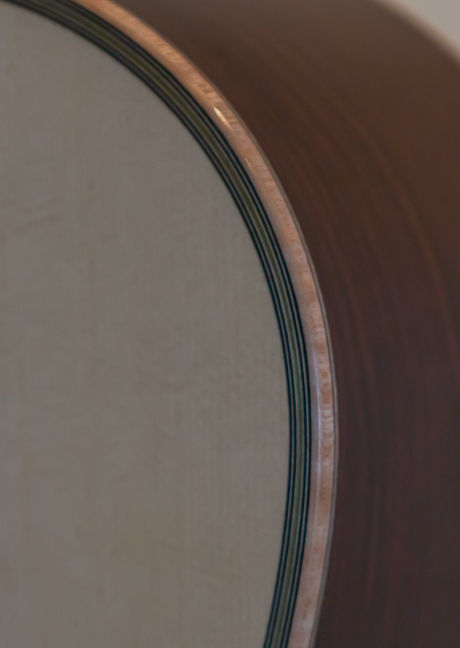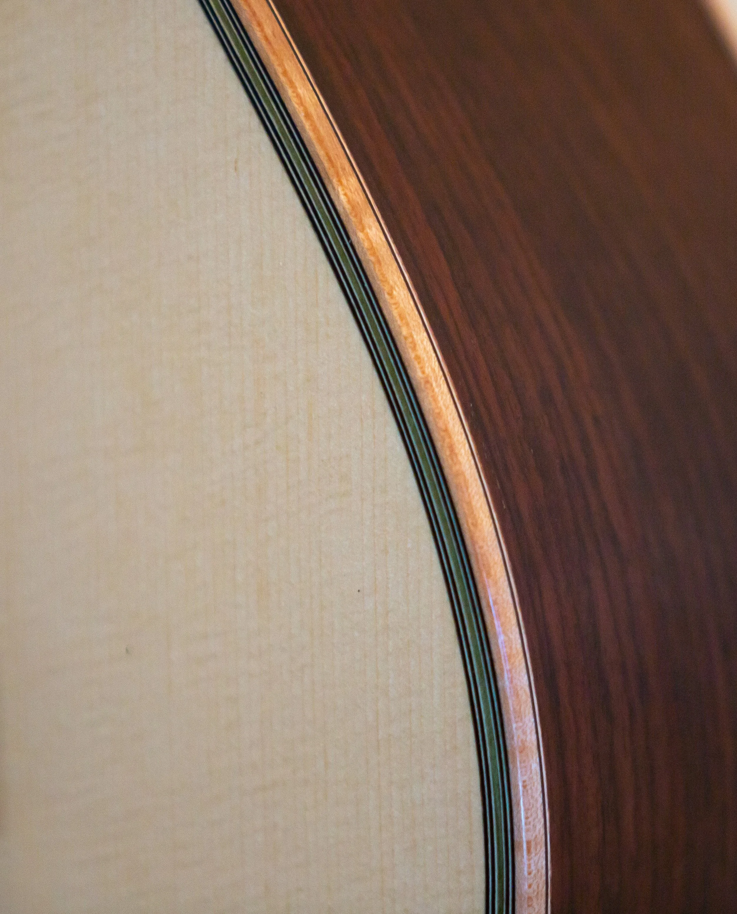 New Solid spruce soundboard with East Indian rosewood back and sides accented with birdseye maple center strip. Scale 650 mm. Very open and luscious tone. PRICE $8400. Posted June 2021. SOLD