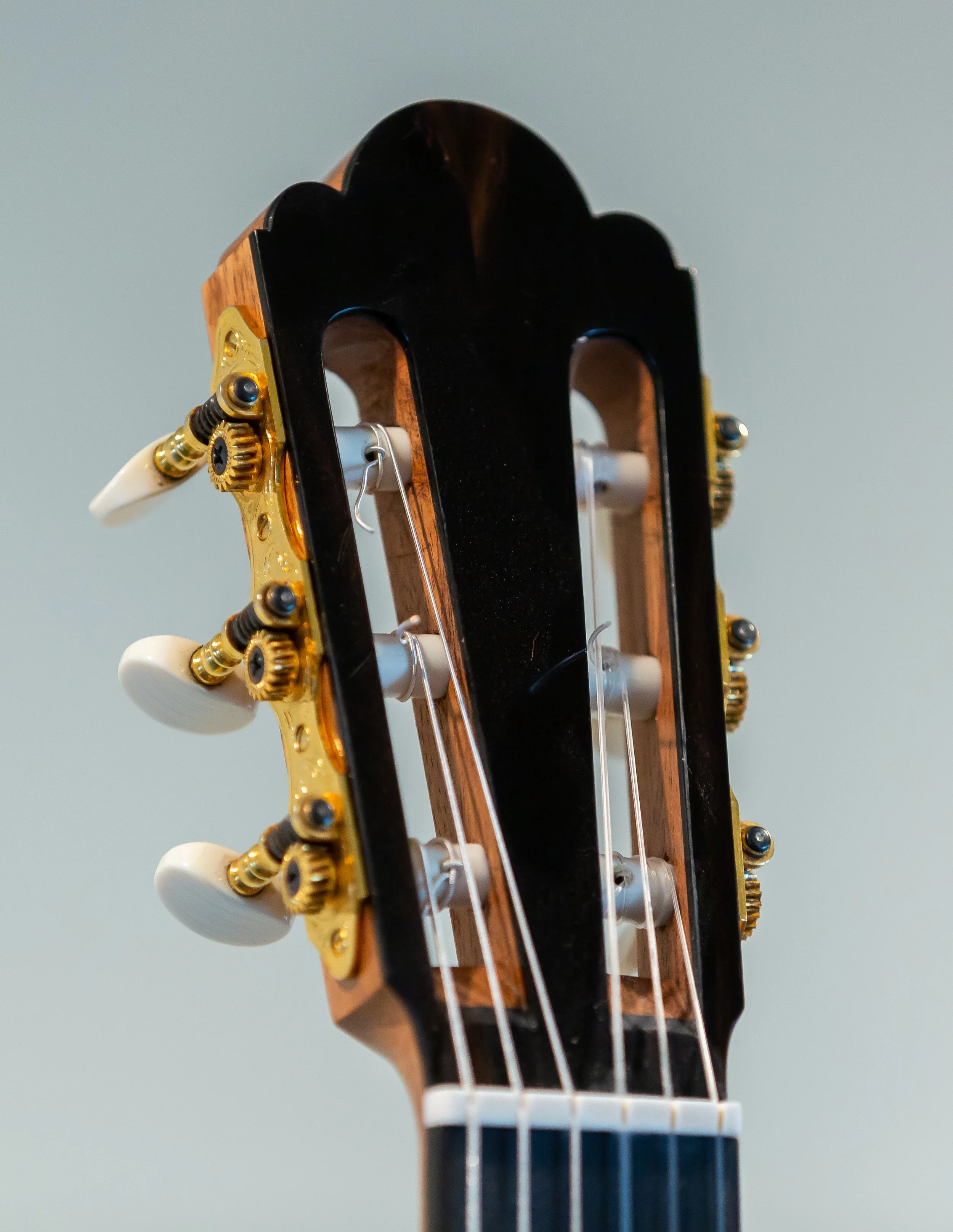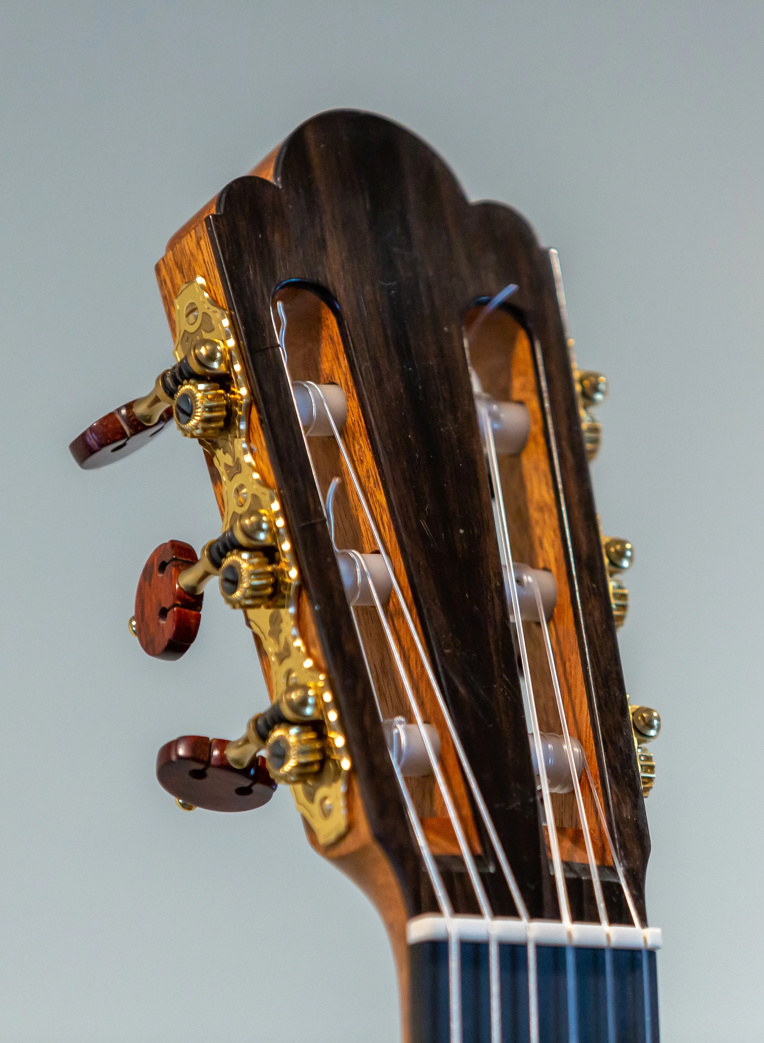 Features a cedar soundboard, and three piece sides, in maple and cocobolo, back with matching maple fillet. Multi-layered green purfling. The rosette is a copy of the Torres SE 114 Tarrega played until the end of his life. Ebony carved head with Excalbar sword ornament. Adjustable/sliding saddle. French polished, scale is 650 mm, futzed with Gotoh Premium tuners. Price: $8400 Available 6/21/2023. SOLD September 15th 2023.