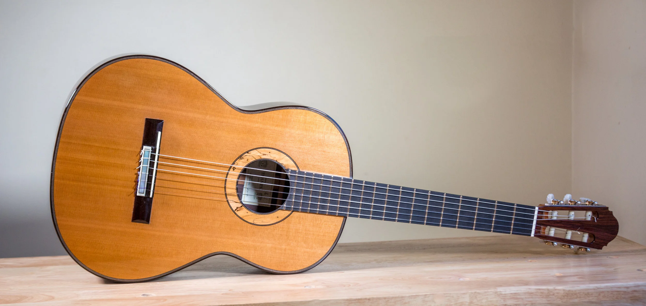Cedar veneers with balsa-wood inner core. Back and sides are East Indian rosewood aged for 45 years. Back/sides, and neck lacquered with a French polish/lacquered top. Scale is 650mm. Very loud and refined sounding with poppy trebles and a deep bass! Price $7800.