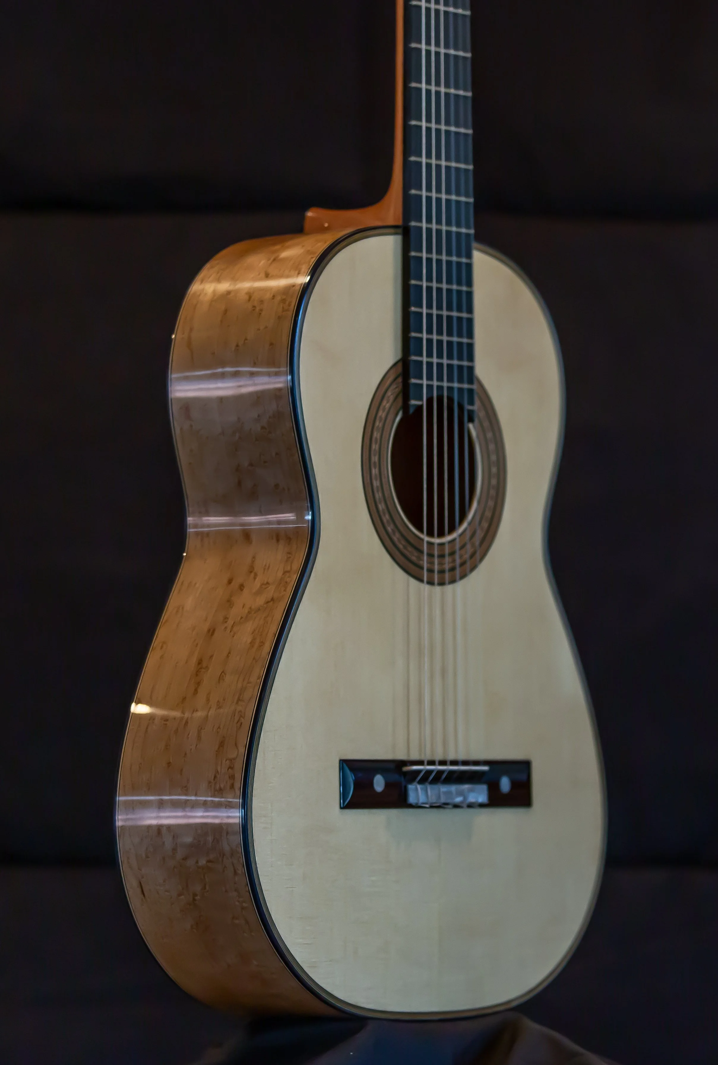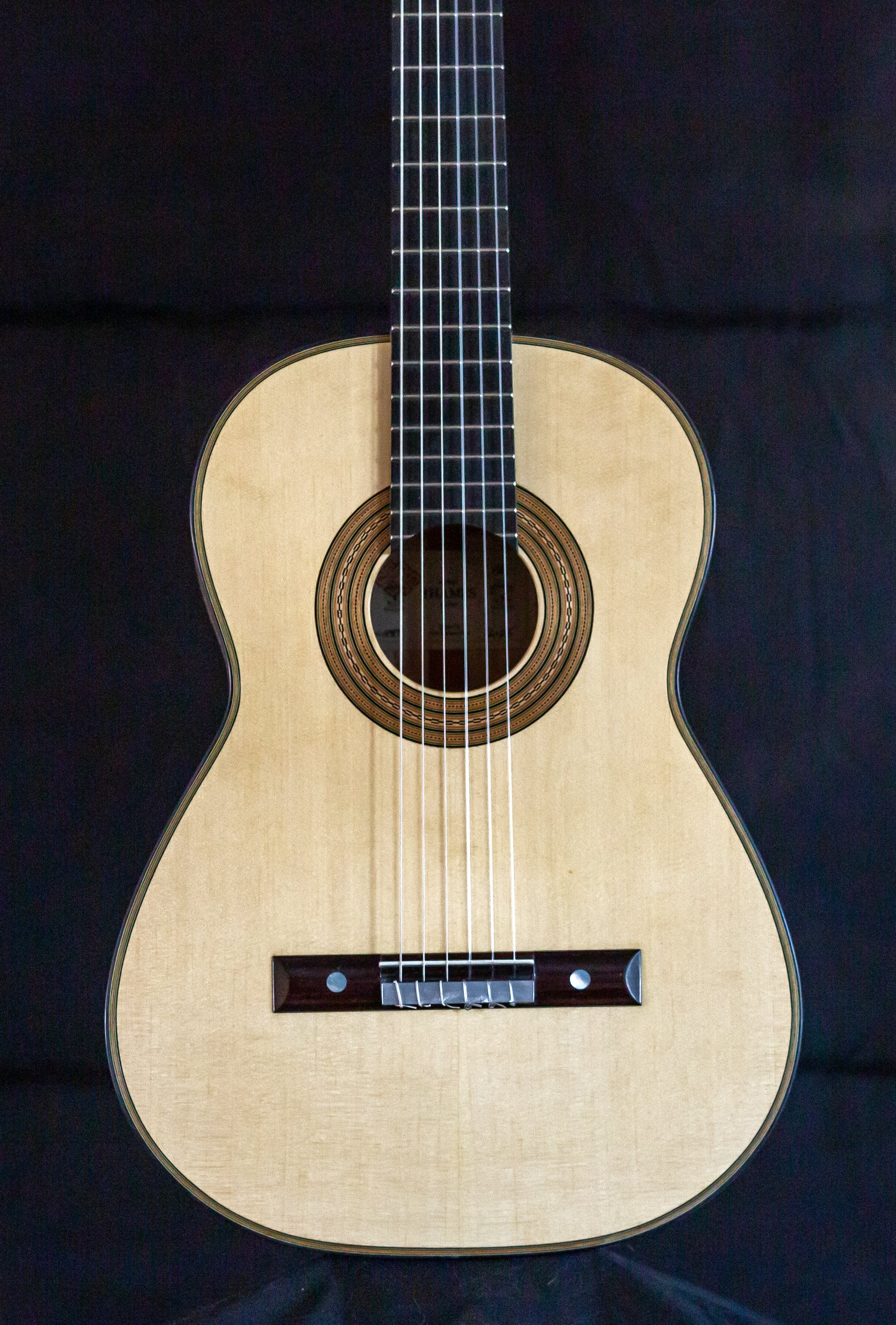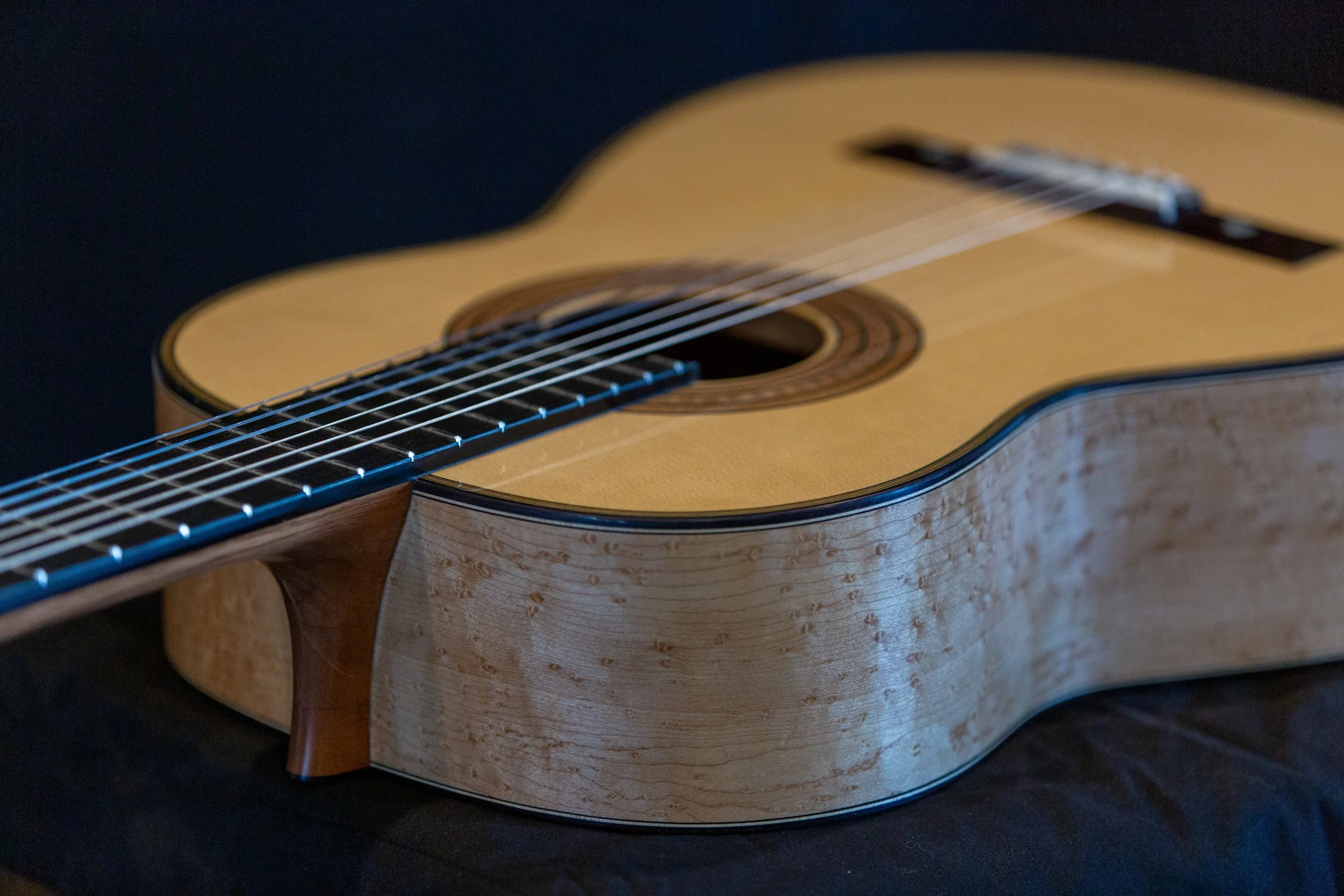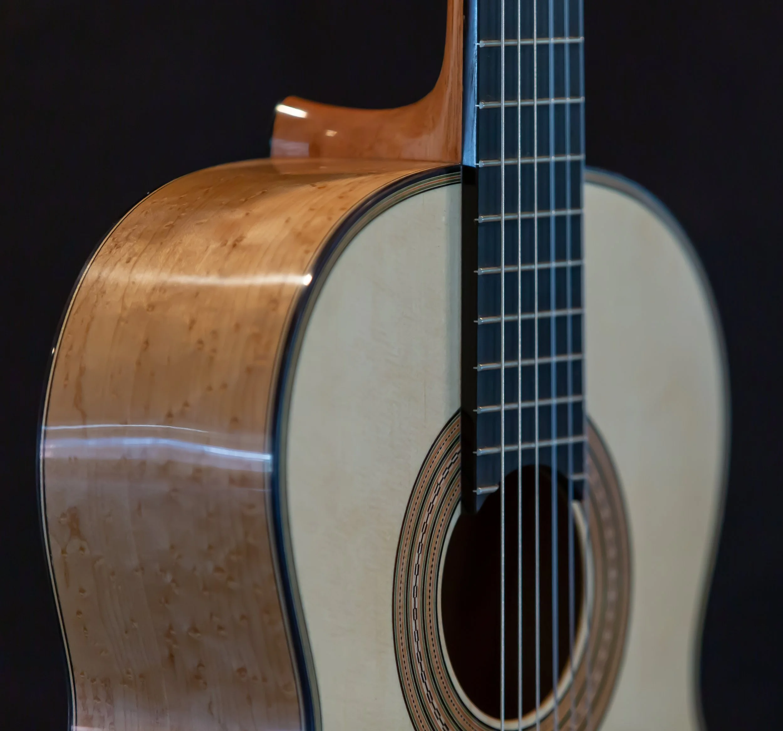 Torres SE-114 body with Birdseye maple back and sides, spruce soundboard. Lacquer back and sides<French polished top. strung up December 20th 2025. PRICE $10,500.