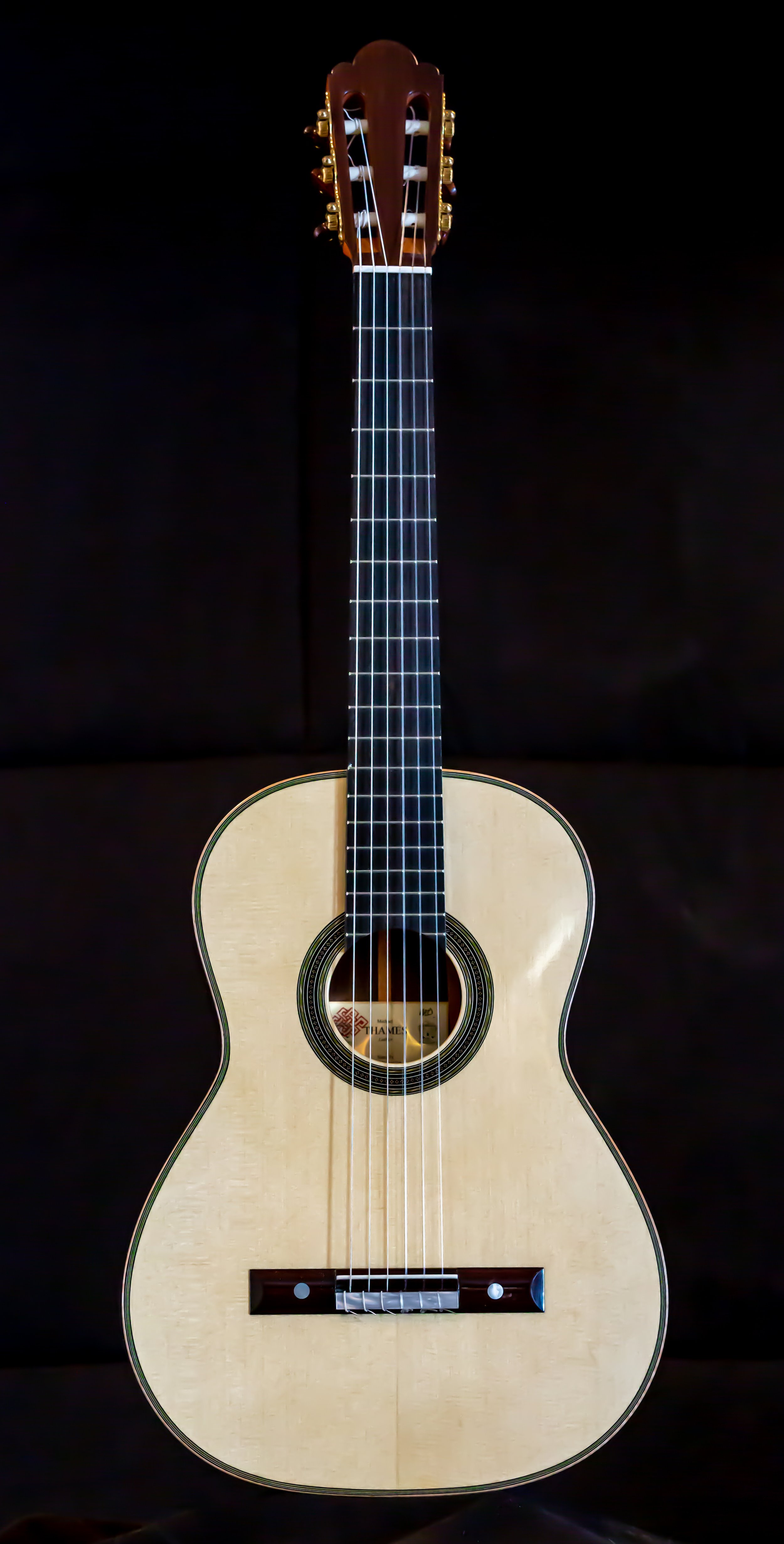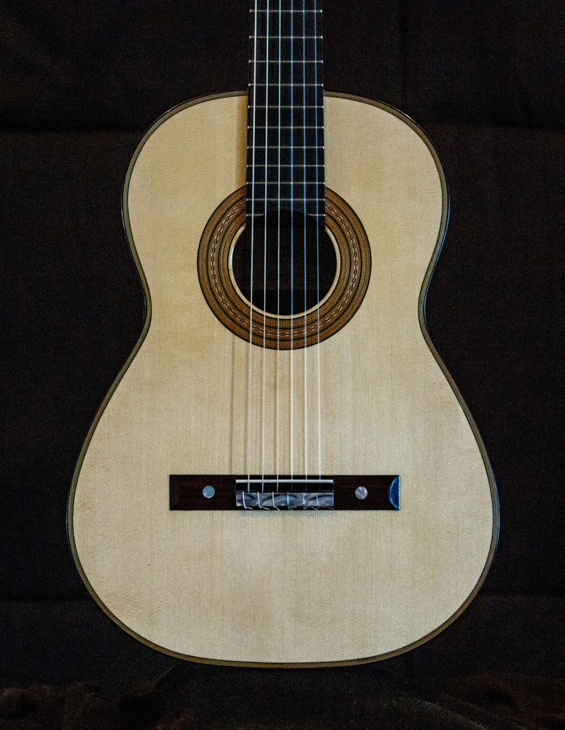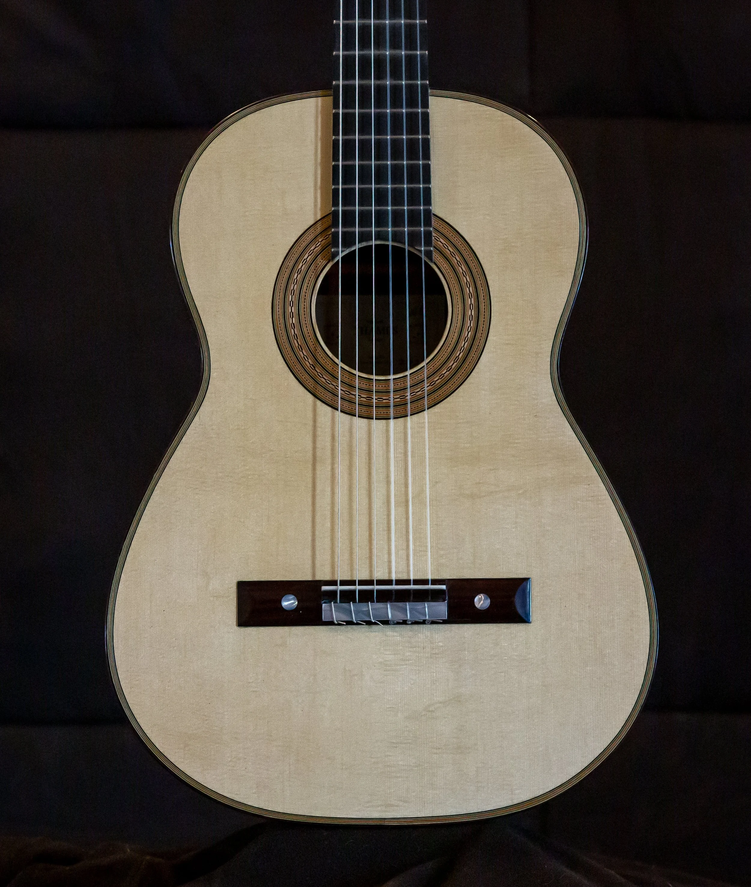 “It was made of maple with the soundboard in spruce, the neck and head in cedar, and the fingerboard of ebony. The size was slightly smaller than the usual one. It’s sound hole and contours were bordered with the finest of inlays of a pale green shade with double herringbone purfling; on the head, the back and the ribs was an exquisite rectangular meander inlay. In additional to the spontaneity of sound, due perhaps to it’s tornavoz, there was a clear warm timbre, as if it were of gold. The balance between the bass and treble was proportionally exact in volume and the duration of it’s vibrations equally generous throughout the fingerboard. It sufficed to finger a perfect chord in order that, by plucking only the three bass notes one could clearly preceive the harmonics of the other strings” — Emilio Pijol, from Antonio de Torres His life and Work, by Jose Romanillos.