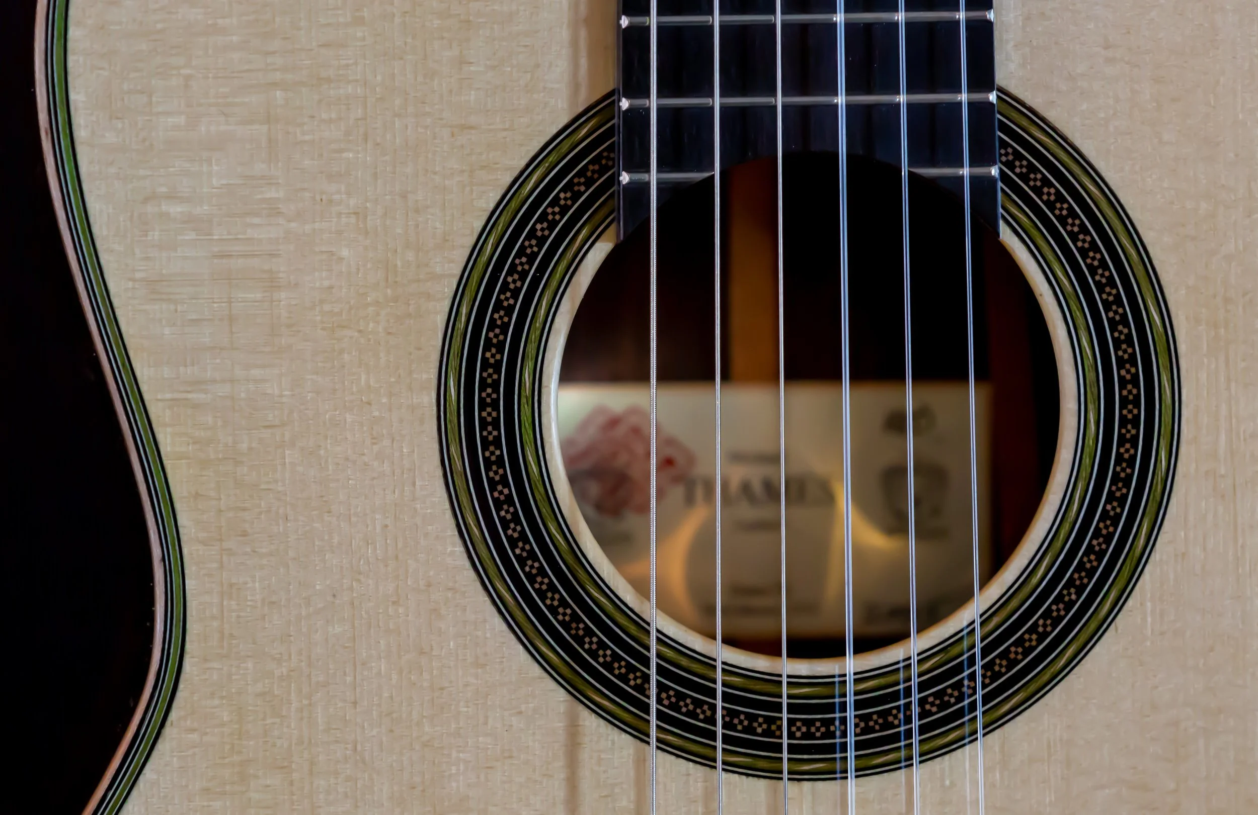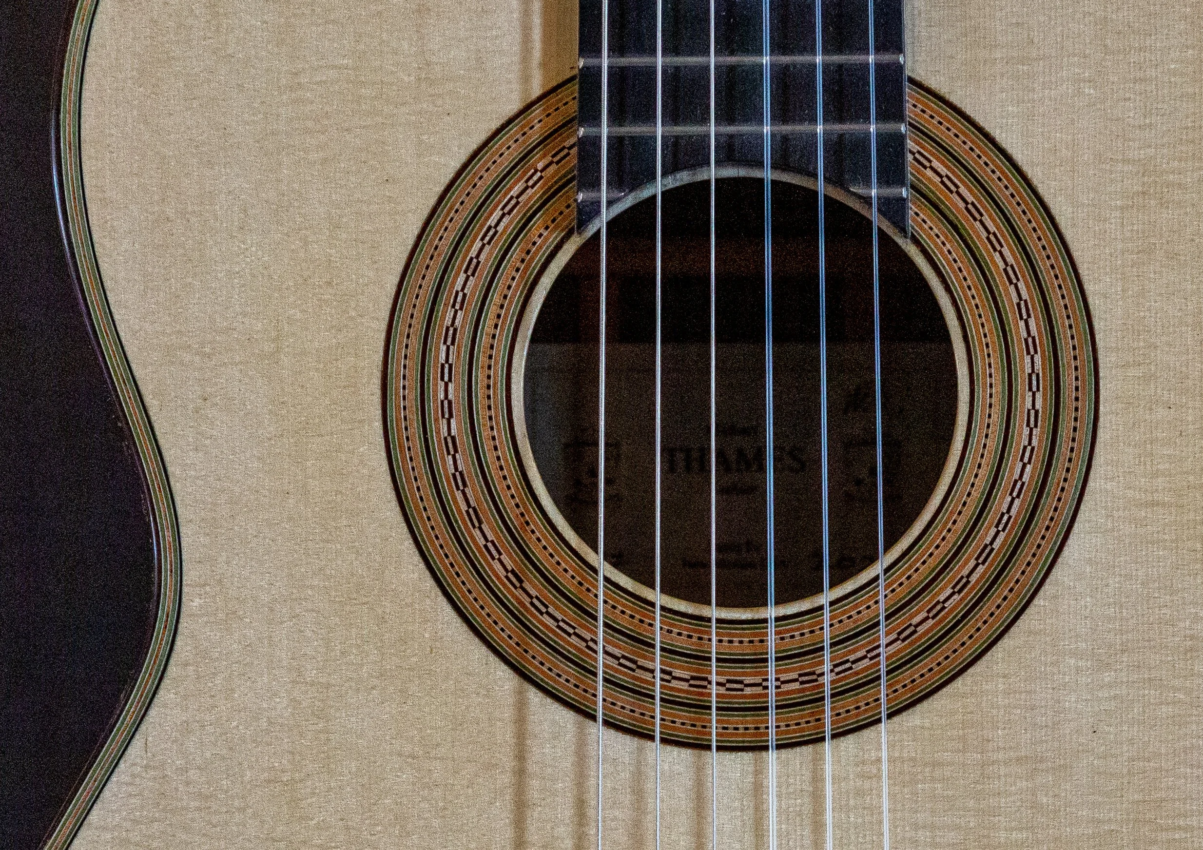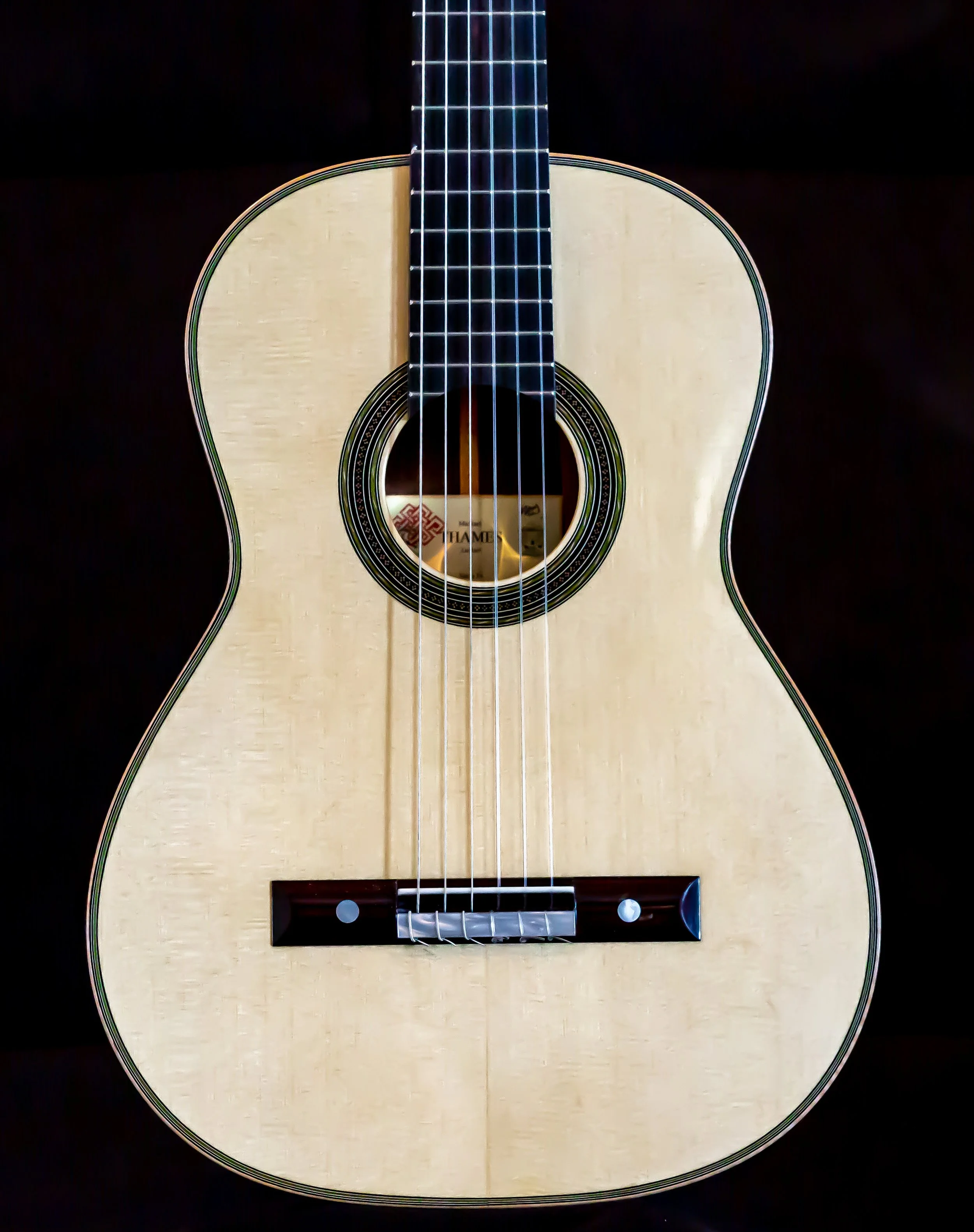 “It was made of maple with the soundboard in spruce, the neck and head in cedar, and the fingerboard of ebony. The size was slightly smaller than the usual one. It’s sound hole and contours were bordered with the finest of inlays of a pale green shade with double herringbone purfling; on the head, the back and the ribs was an exquisite rectangular meander inlay. In additional to the spontaneity of sound, due perhaps to it’s tornavoz, there was a clear warm timbre, as if it were of gold. The balance between the bass and treble was proportionally exact in volume and the duration of it’s vibrations equally generous throughout the fingerboard. It sufficed to finger a perfect chord in order that, by plucking only the three bass notes one could clearly preceive the harmonics of the other strings” — Emilio Pijol, from Antonio de Torres His life and Work, by Jose Romanillos.