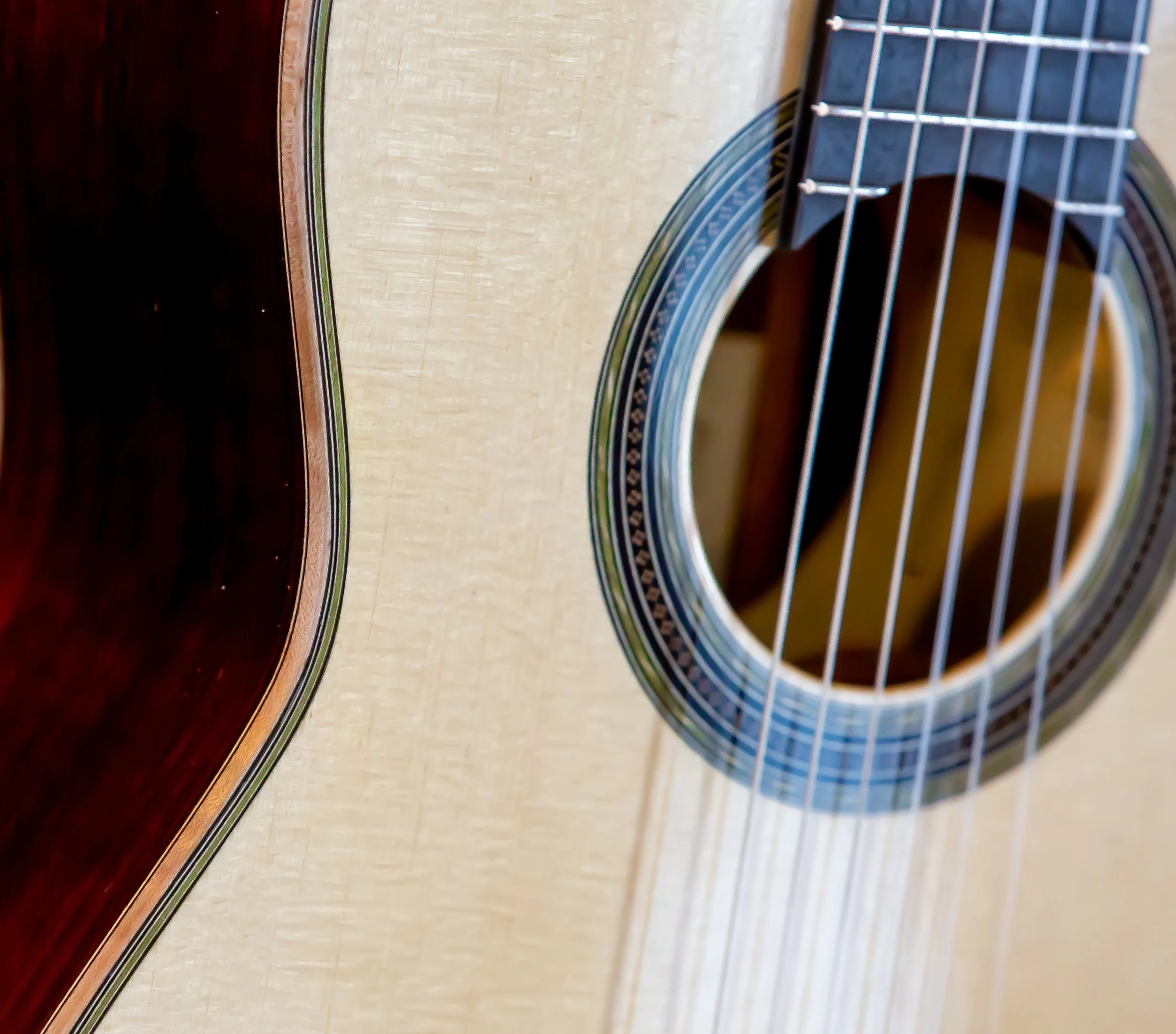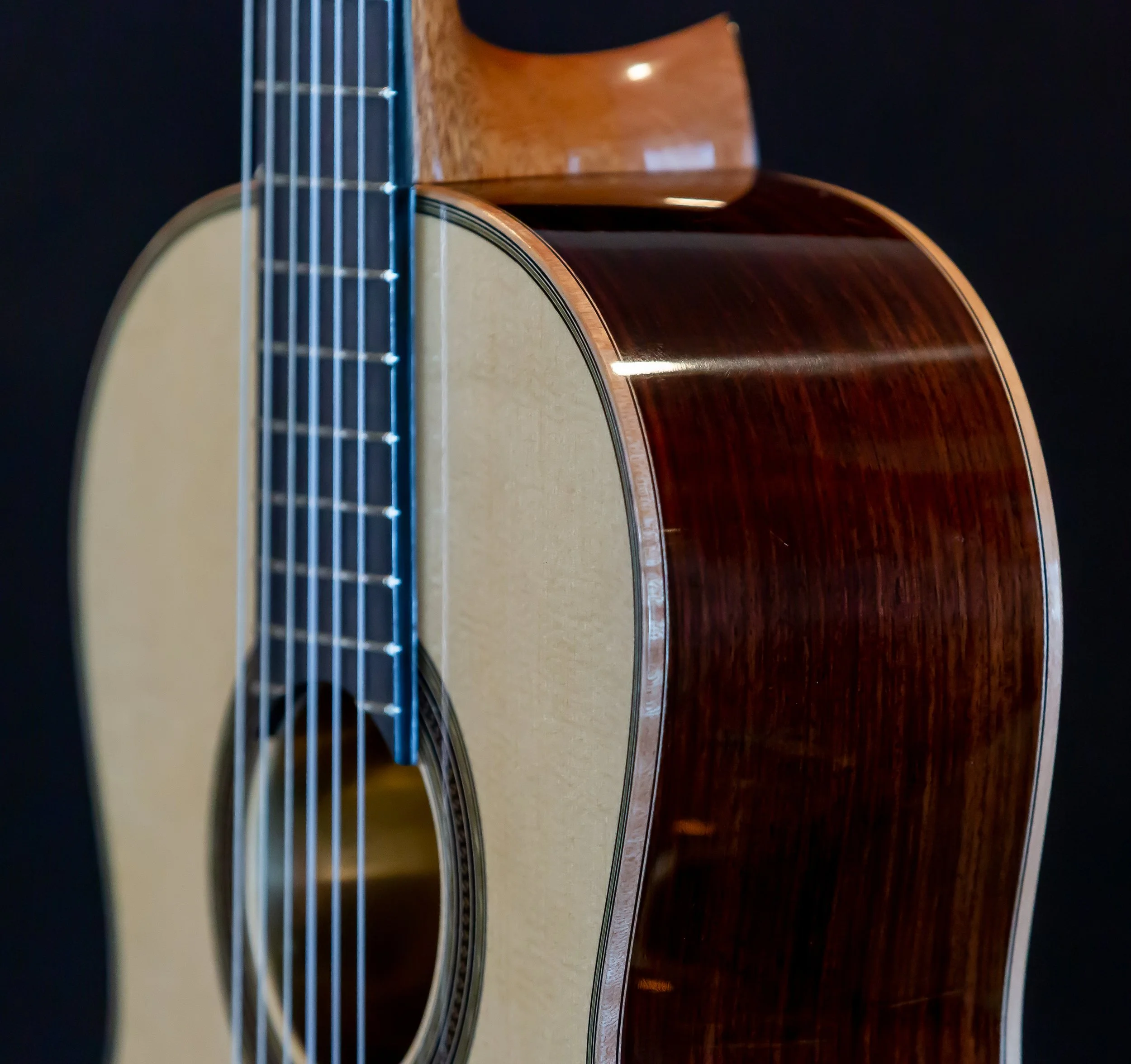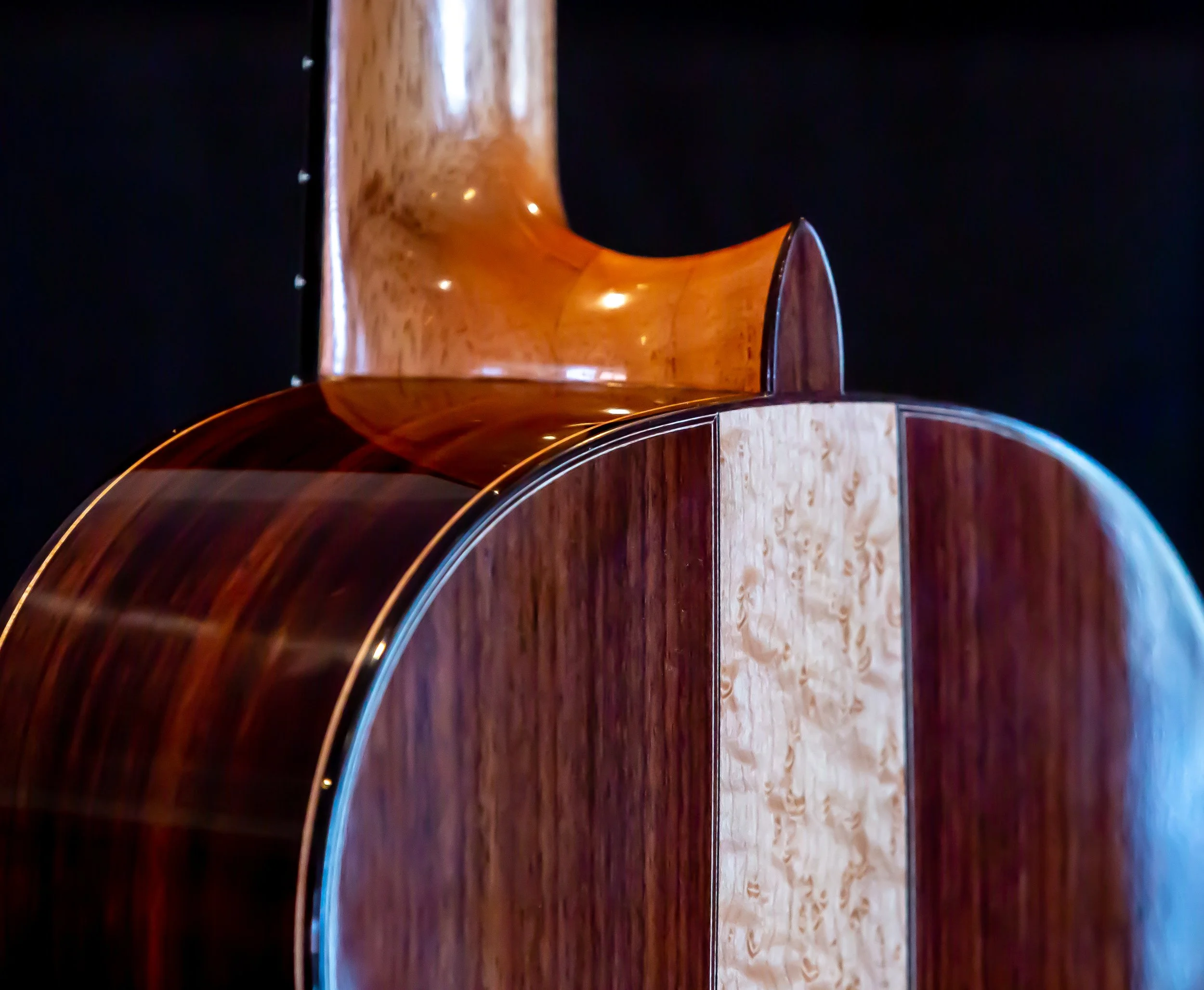 This guitar features both Birdseye and flamed maple, with a spruce soundboard. The rosette and purfling carry a matching theme, and a blue ornamentation. The original had a celluloid material for the blue color, Ive chosen to simply use a blue veneer. French Polished throughout.