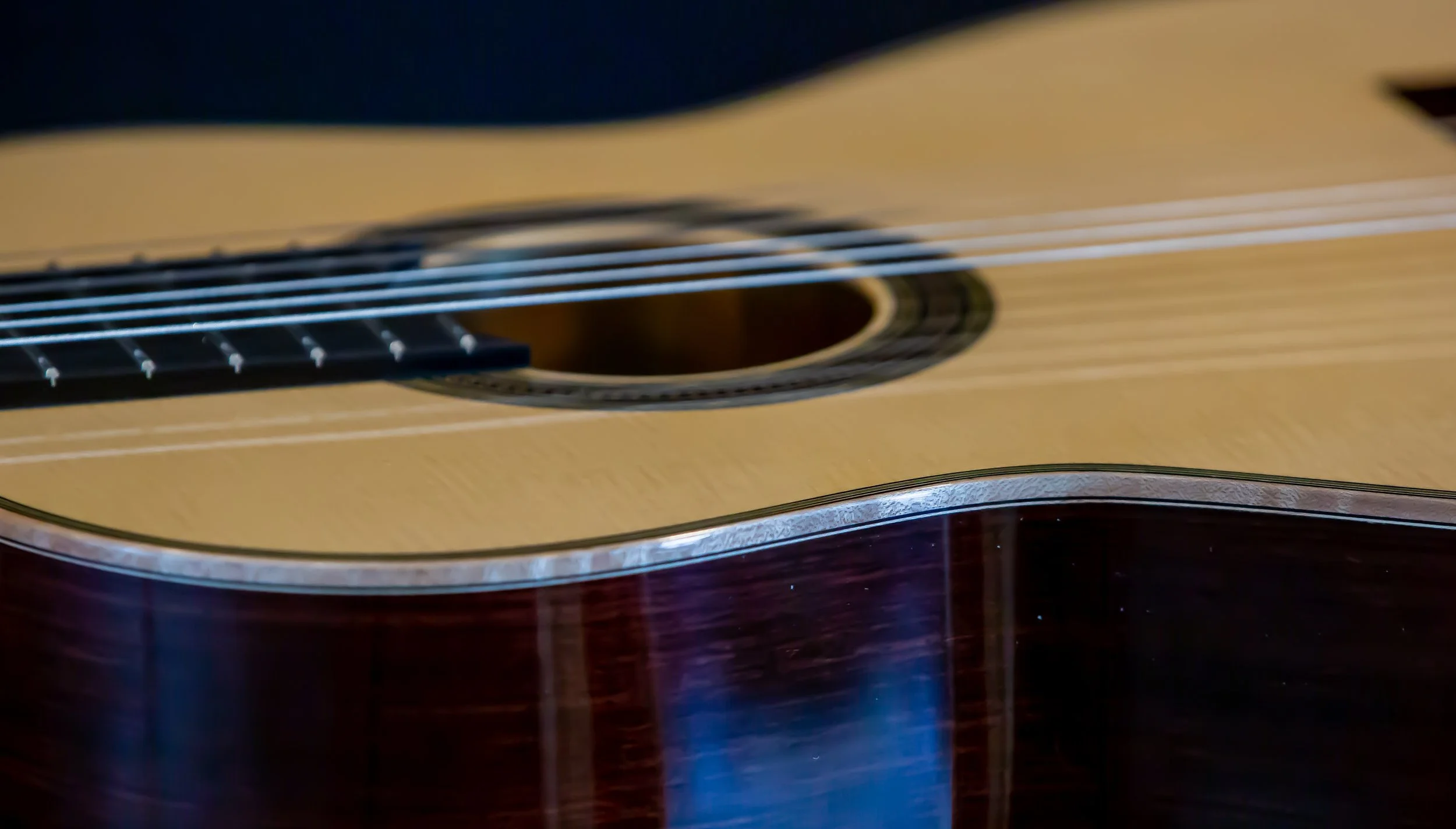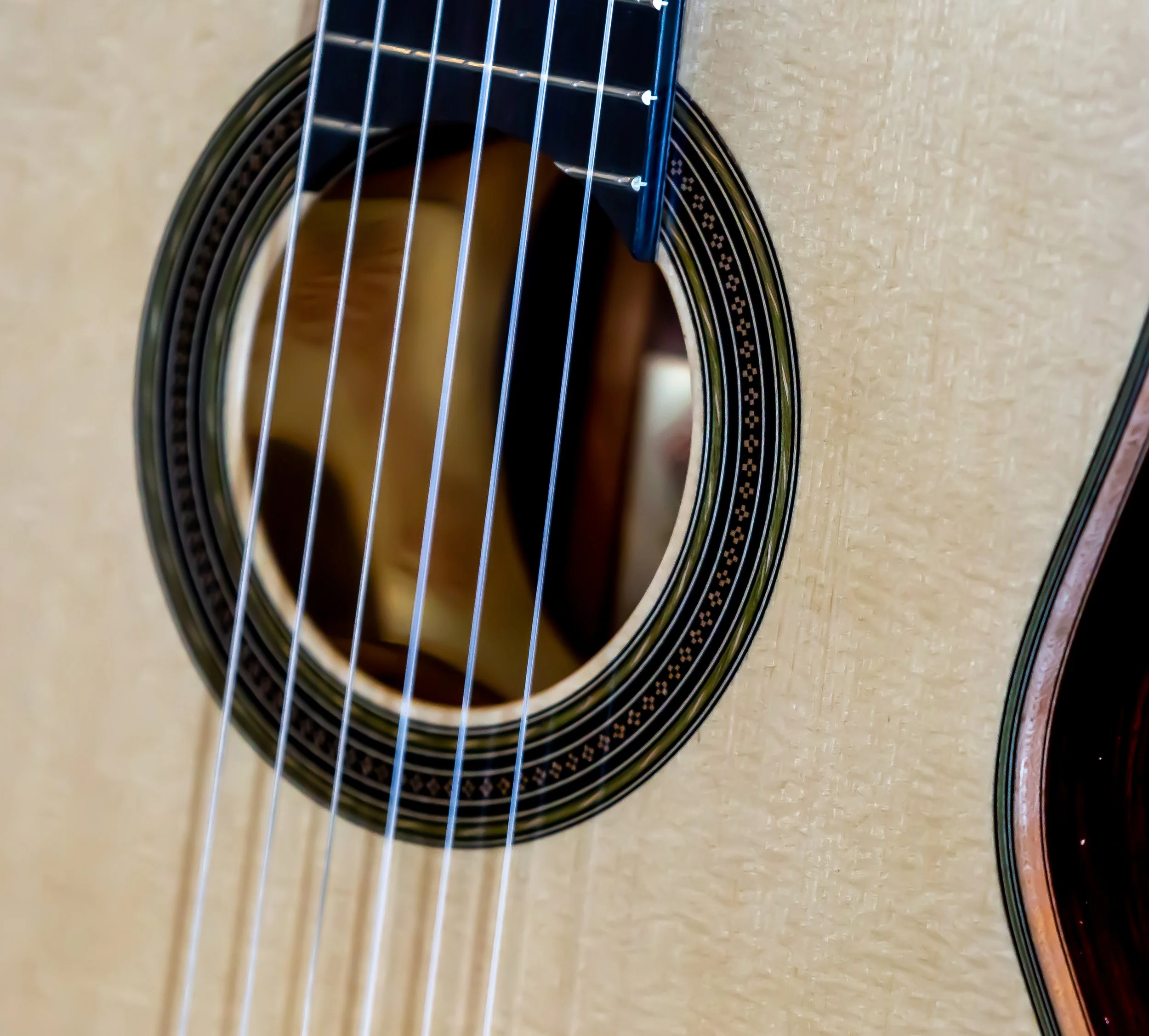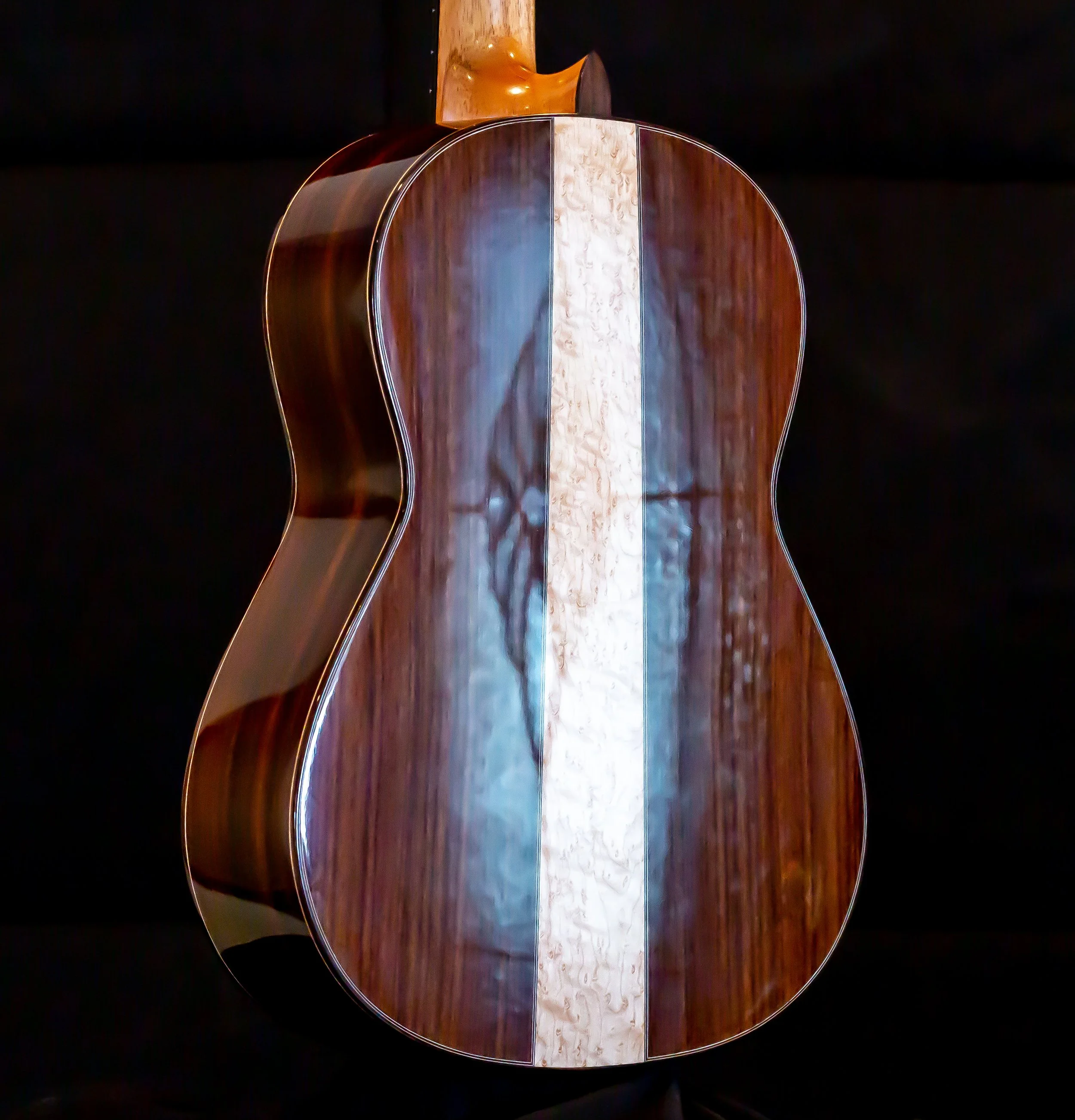 This guitar features both Birdseye and flamed maple, with a spruce soundboard. The rosette and purfling carry a matching theme, and a blue ornamentation. The original had a celluloid material for the blue color, Ive chosen to simply use a blue veneer. French Polished throughout.