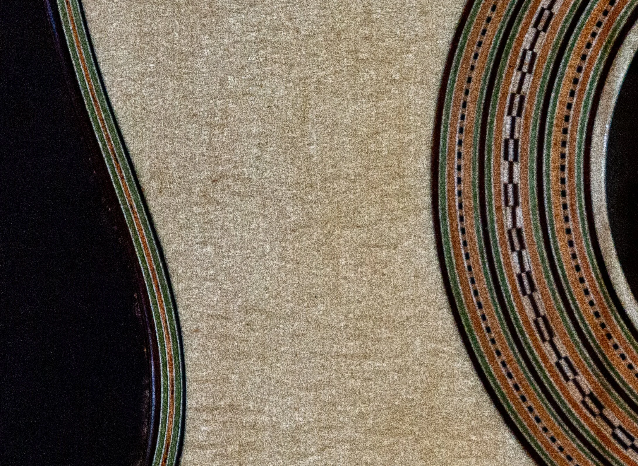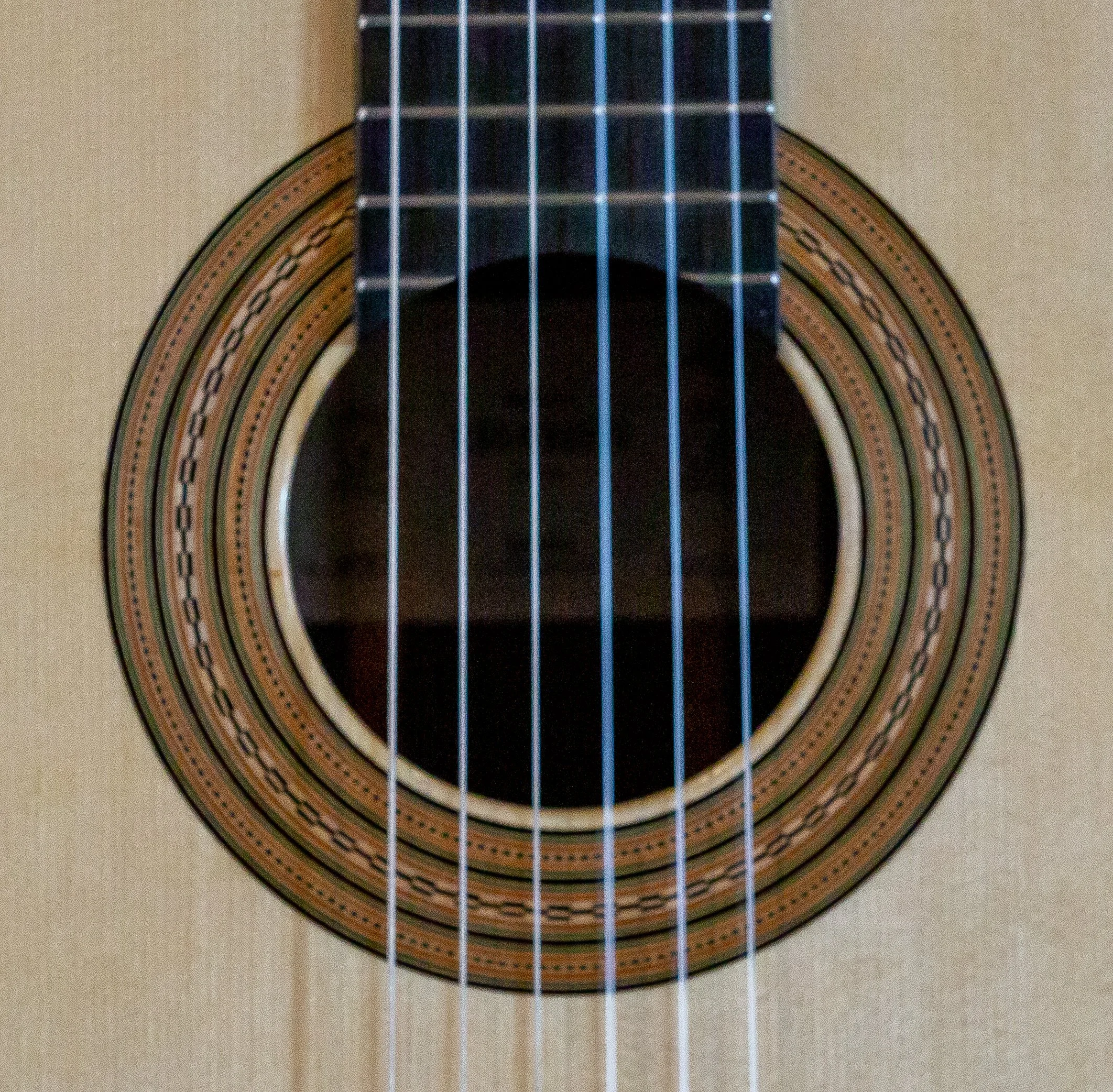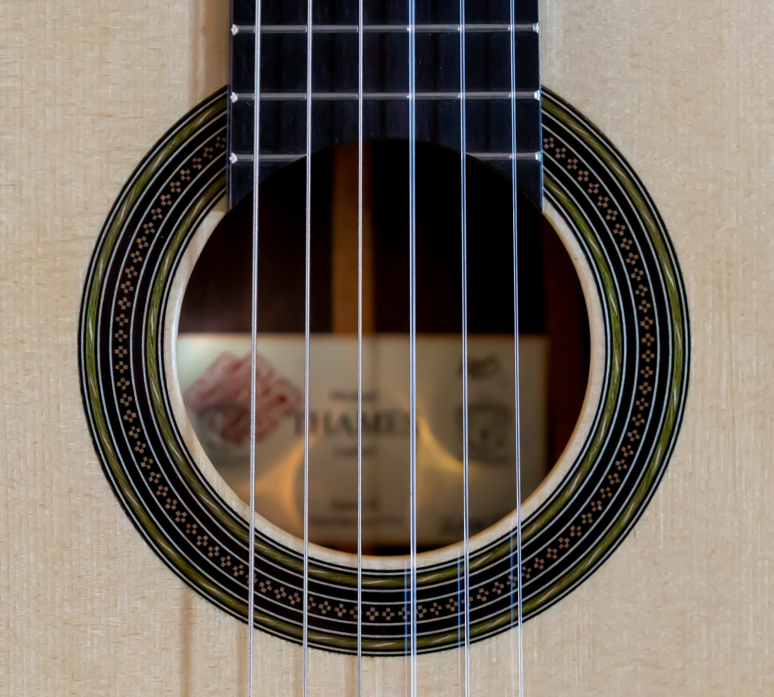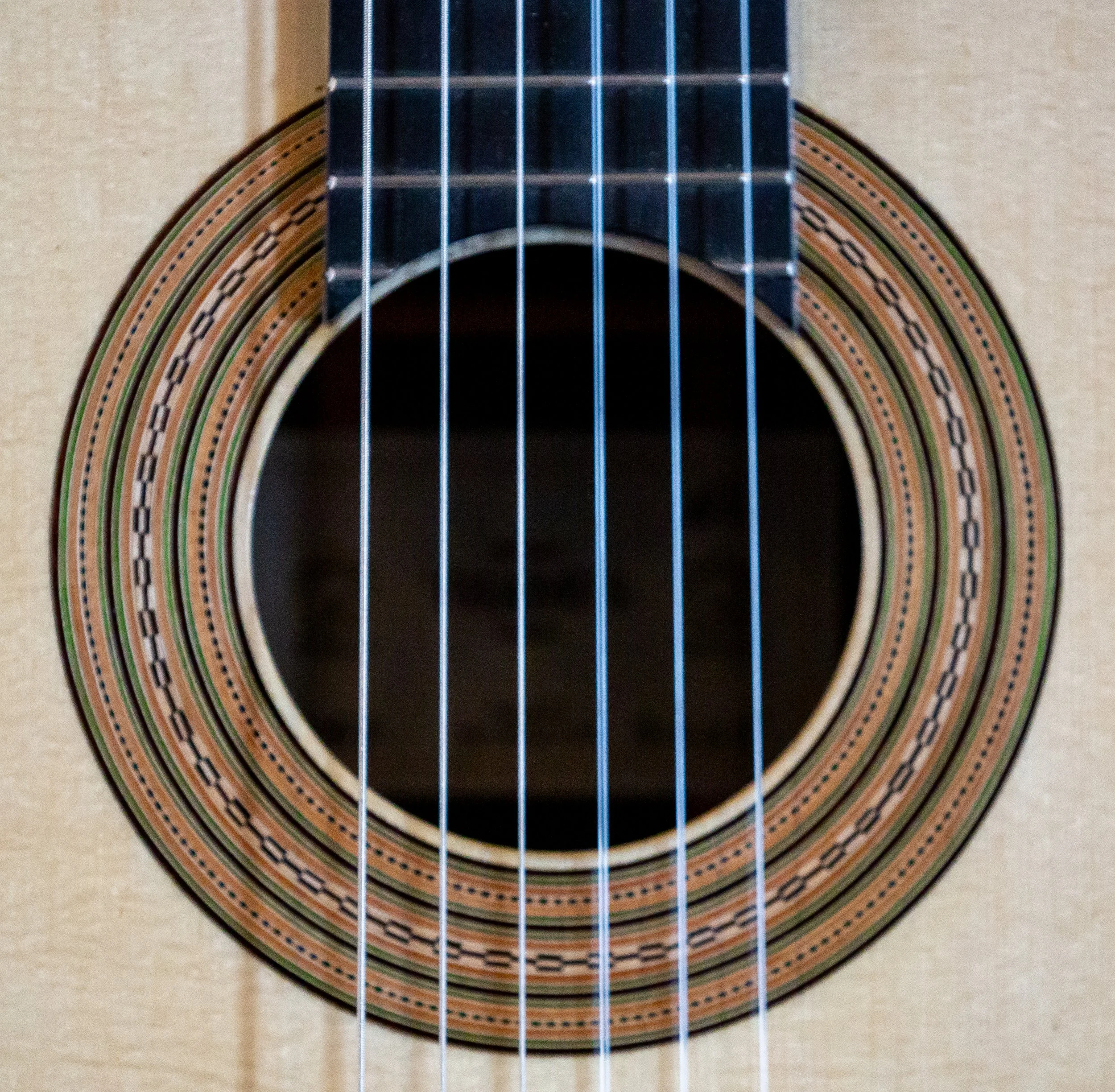 The original has a very unusual blue and pink plastic accent in the rosette and purfling. Some people have suggested it is celluloid. On this copy I went with blue wood veneer instead of the celluloid material. One can only guess what was going through Torres mind using the space age new celluloid.