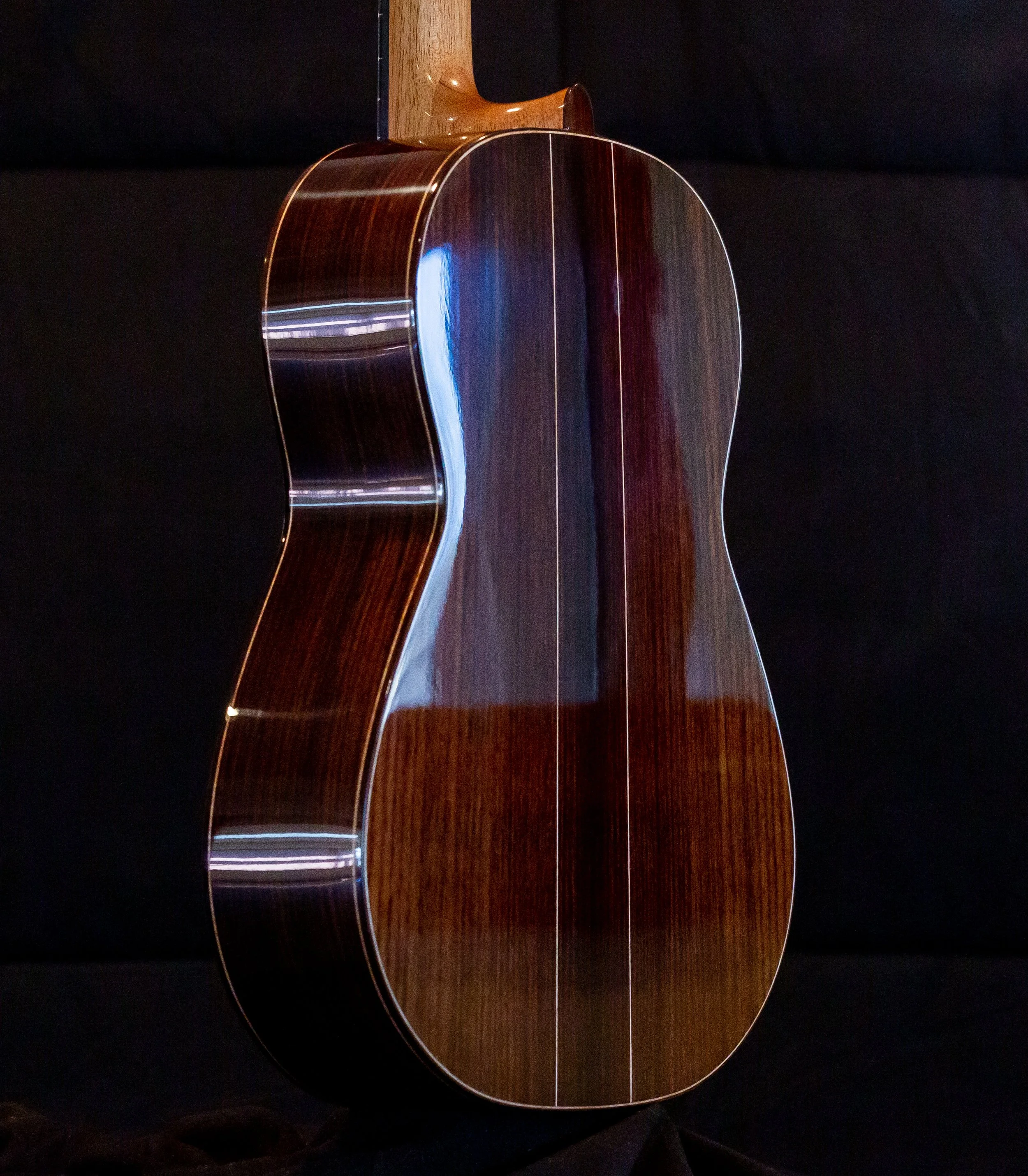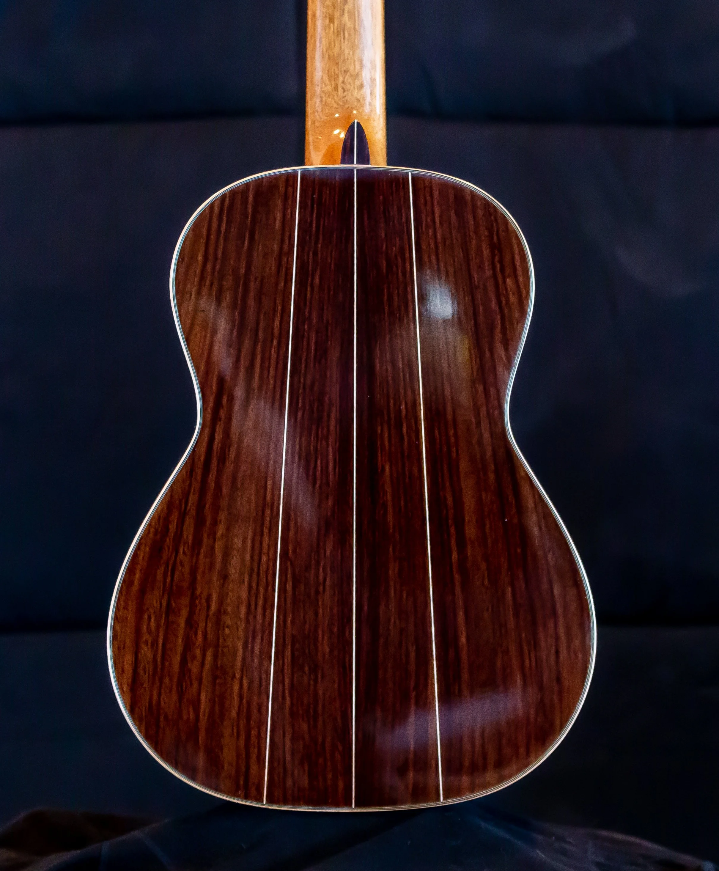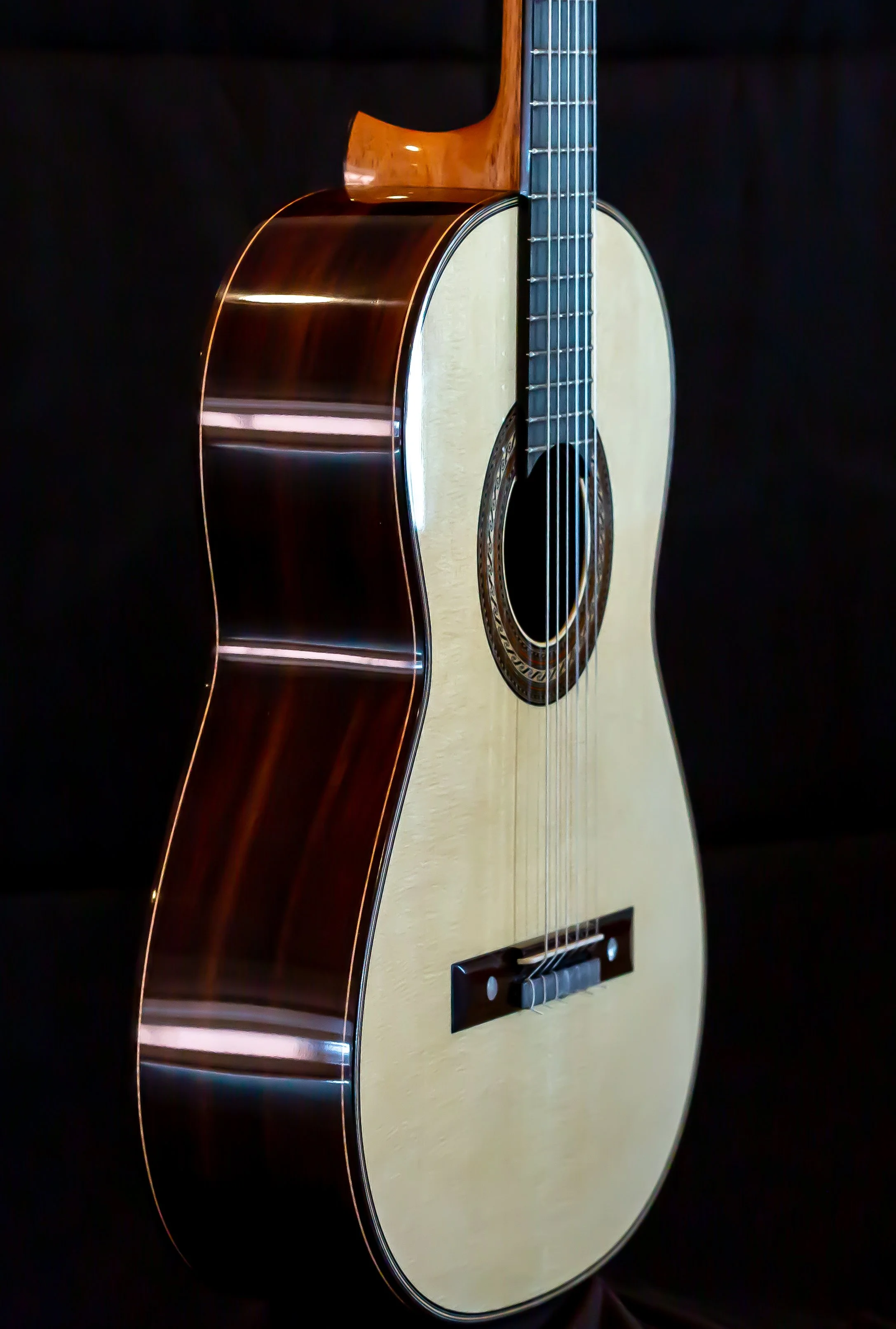 New Solid spruce soundboard with East Indian rosewood back and sides accented with birdseye maple center strip. Scale 650 mm. Very open and luscious tone. PRICE $8400. Posted June 2021. SOLD