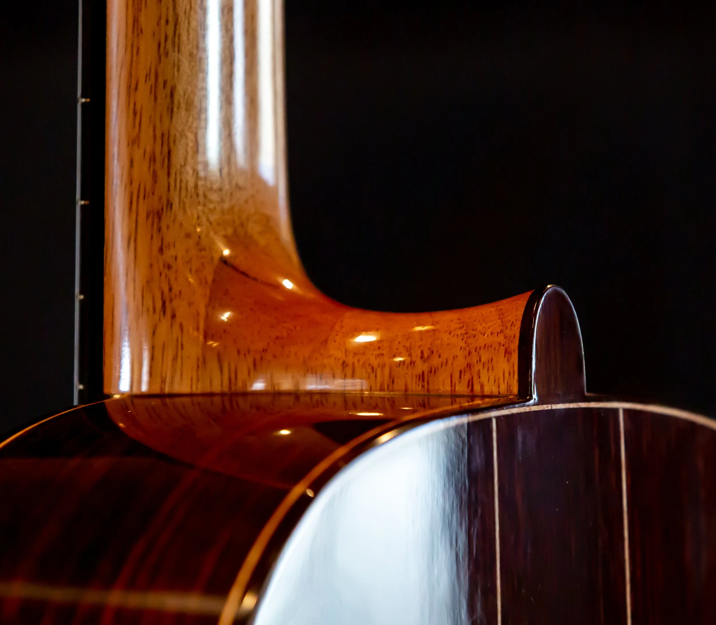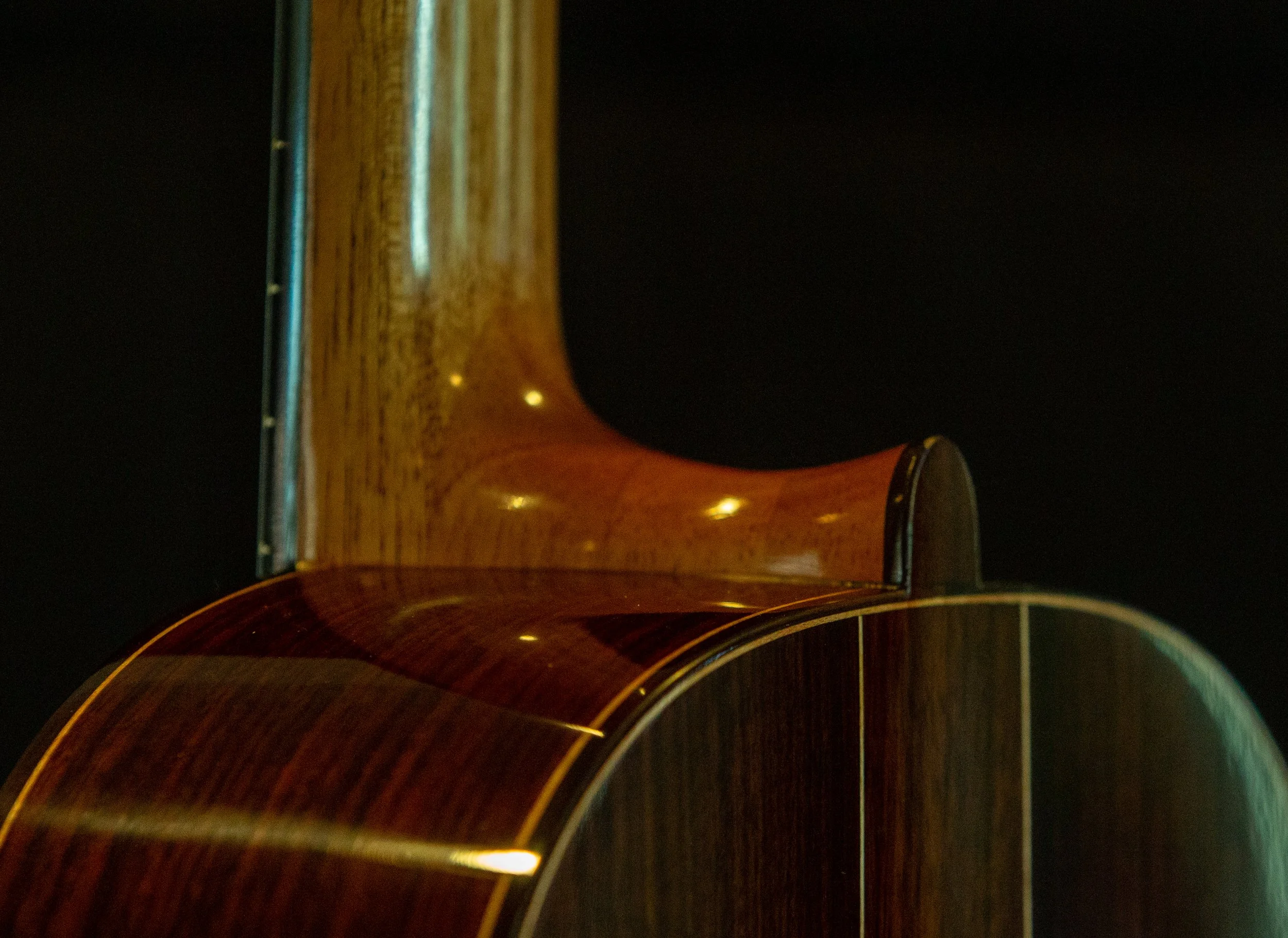 I’ve designed this guitar after a German Swan Neck Baroque Lute, of which Weiss invented. The neck is tilted so that the bridge sits in the middle of the lower bout, as did lutes of the period. The tilting of the neck allows the player to ergonomically remain in the same position with the left hand. in other words, if you dont tilt the neck up adding more strings and centering the neck will position your left hand lower, which isn’t as comfortable. The Daipason bass strings are longer than the freed strings allowing the diameters to be less than if they were all stopped at the nut. This makes the basses more lively and they have less sustain than larger diameter strings, keeping the guitar in the tradition of the times.