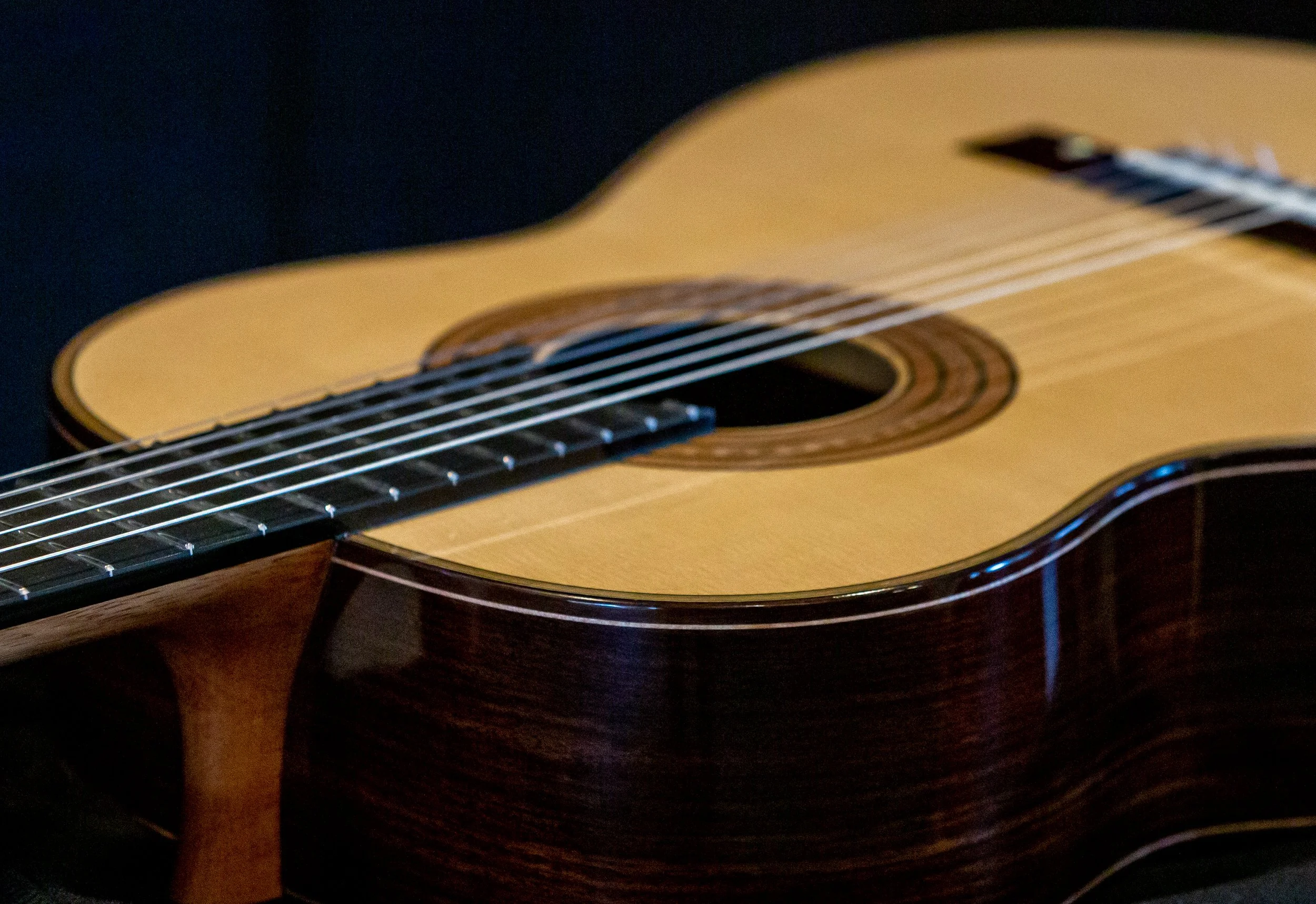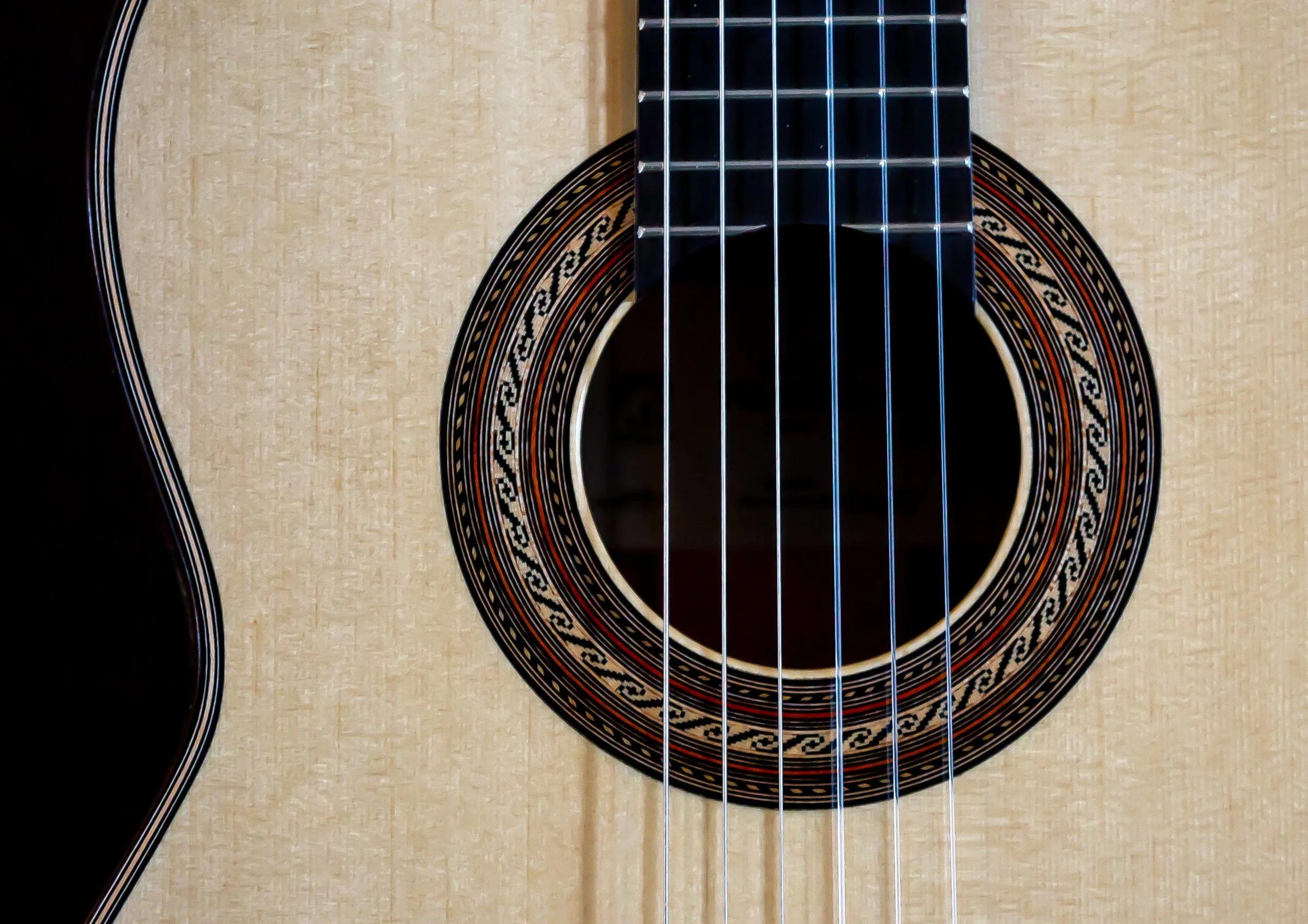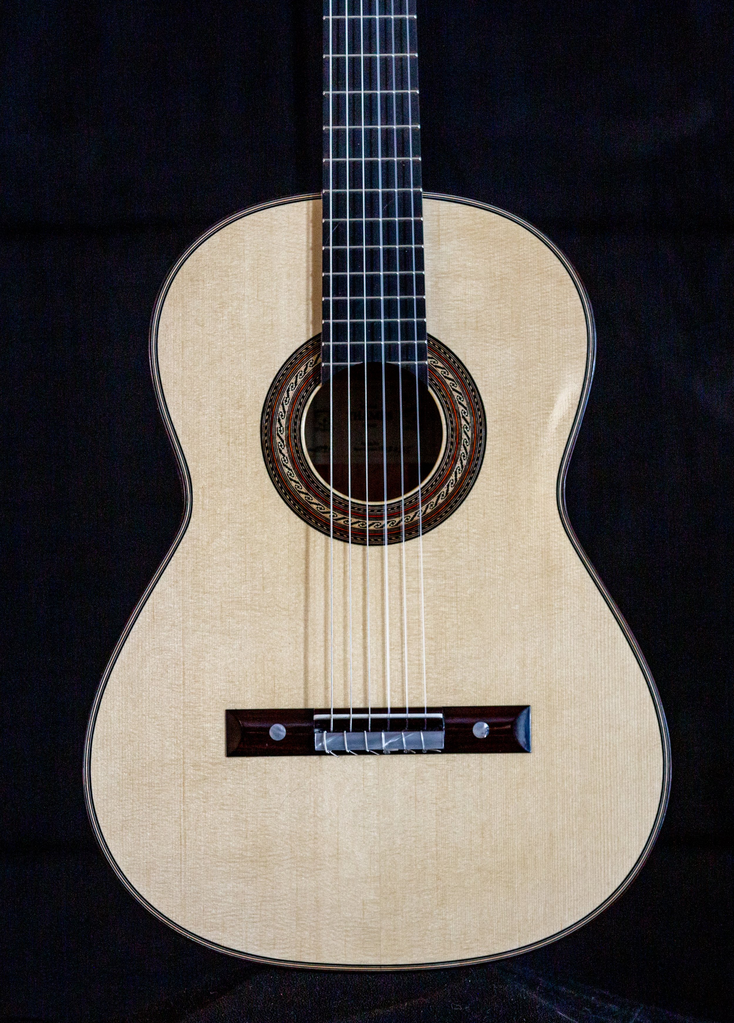 Beautiful Torres inspired guitar. Back and side wood is unknown, I found this wood in a hardwood store and bought it right away thinking it would make a great guitar — I was right! Lacquered back and sides and French polished top Nut is 52 mm, and 650 scale. Very bold and at the same time delicate sound, easy on the nails! AVAILABLE 1/7/2026. PRICE $12,000.