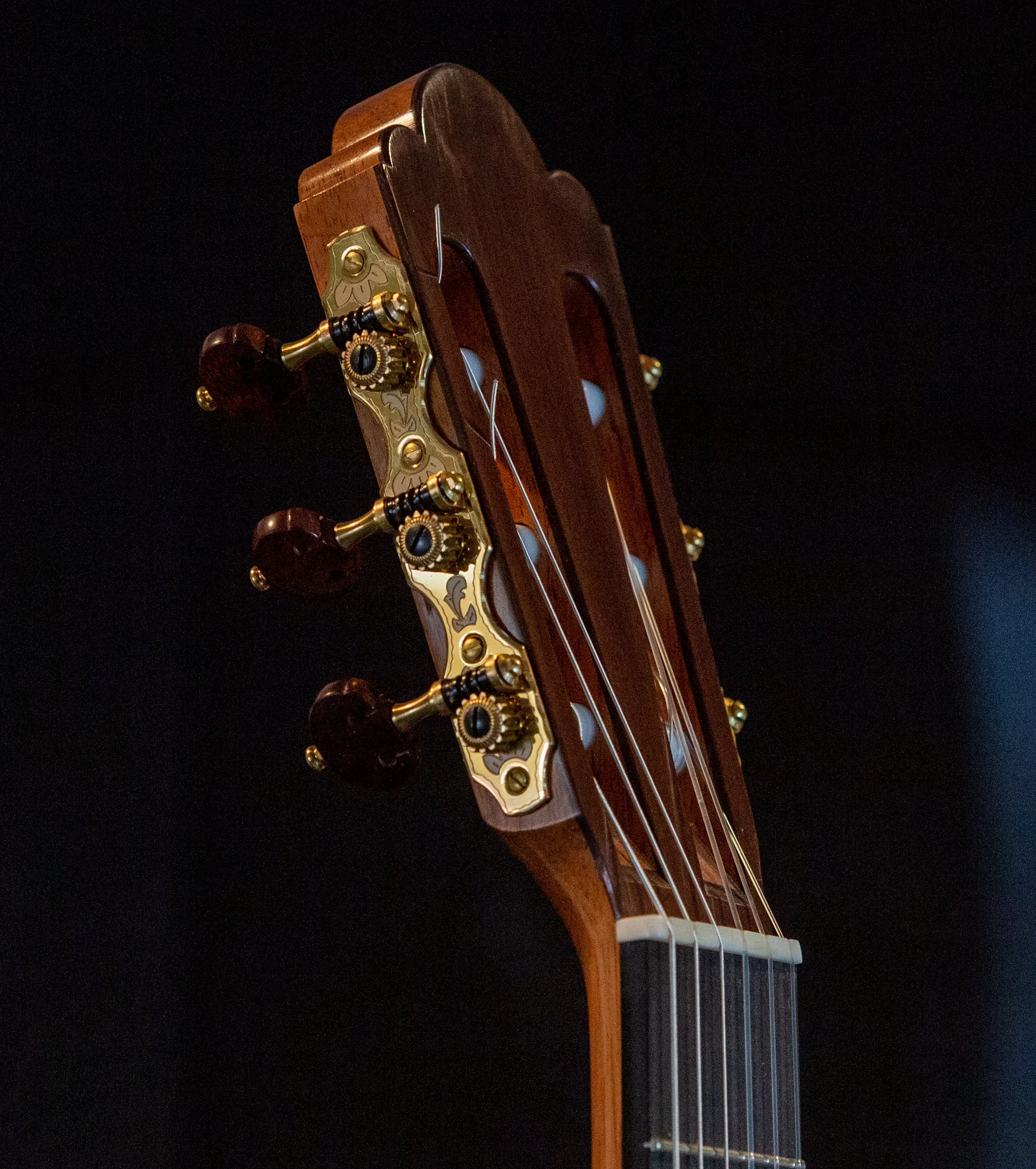 This particular guitar has a 3 piece top in the style of so many Torres guitars. Back and sides of Cypress ( same as original). The original has a Tornavoz, on some La Leona guitars I include a Tornavoz upon request, on this one I didn’t include one. I also modified the original bridge to a more user friendly one with an adjustable saddle.