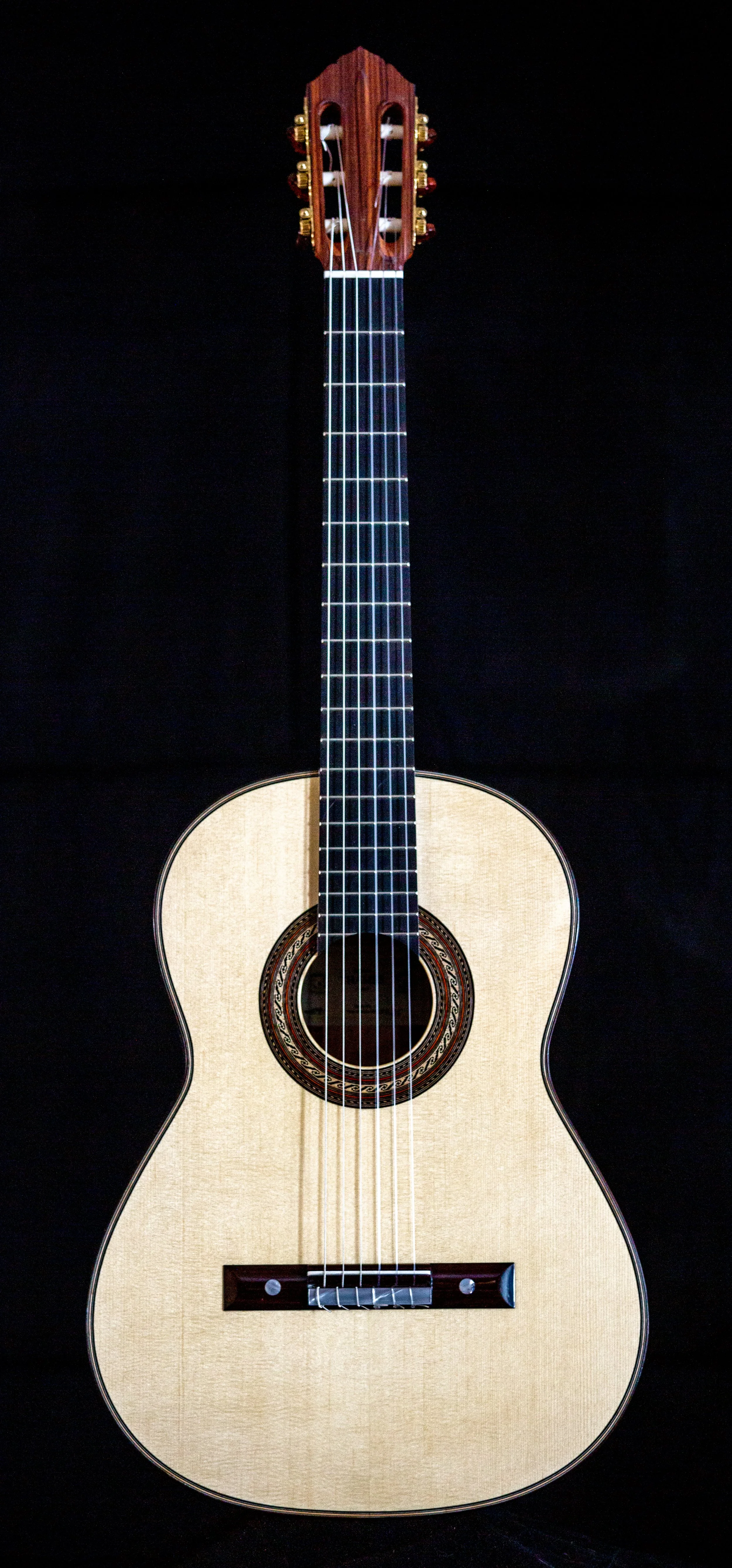 Features a cedar soundboard, and three piece sides, in maple and cocobolo, back with matching maple fillet. Multi-layered green purfling. The rosette is a copy of the Torres SE 114 Tarrega played until the end of his life. Ebony carved head with Excalbar sword ornament. Adjustable/sliding saddle. French polished, scale is 650 mm, futzed with Gotoh Premium tuners. Price: $8400 Available 6/21/2023. SOLD September 15th 2023.
